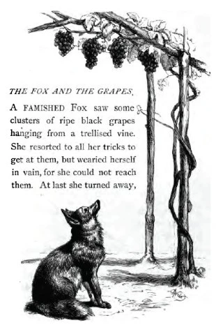 "굶주린 여우가 포도나무를 타고 올라갔다. 포도 덩굴에 포도송이가 달린 것을 보고 따려 했으나 딸 수가 없었다. 여우는 그곳을 떠나며 중얼거렸다. '그 포도송이들은 아직 덜 익었어.'"
