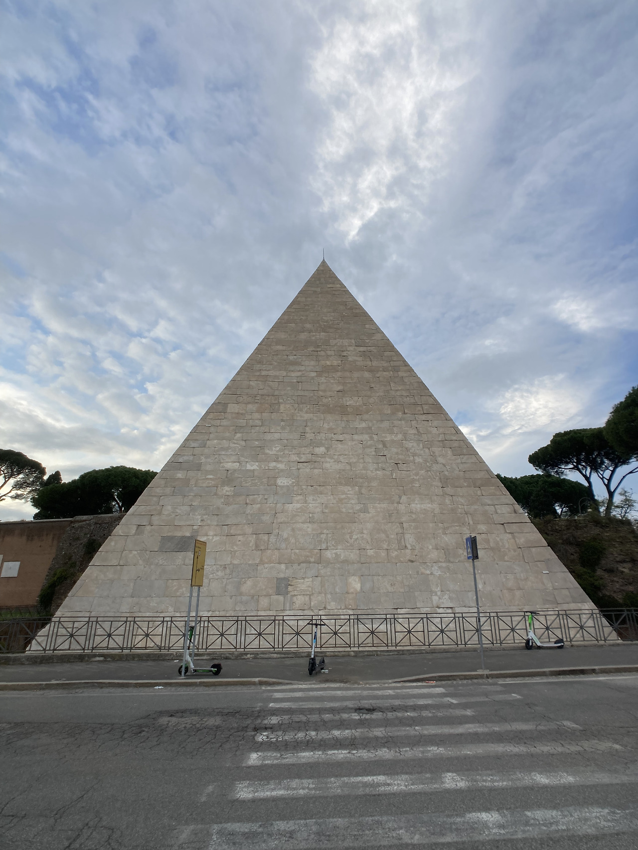 성문 옆에는 이집트에서 볼법한 37미터 높이의 피라미드가 있습니다. 기원전 18년에서 기원전 12년 사이에 지어졌고 기간은 피라미드의 동쪽 편에 새겨져 있는 것처럼 330일이 소요되었다고 한다. 이 피라미드의 역할은 이집트의 것과 같이 무덤이었으며 주인은 정면에 이름이 새겨져 있는 것처럼 가이오 체스티오 에풀로네 (Gaio Cestio Epulone)입니다. 기원전 30년에 이집트를 로마 제국의 속주로 편입시키면서 그들의 웅장한 피라미드 무덤을 보았던 로마의 권력자들은 자기들도 그와 같은 것을 같고 싶은 욕망을 가졌을 것입니다. 그래서 이 시기에 로마에는 유행처럼 이와 비슷한 무덤들이 더 있었다고 합니다. 3세기에 아우렐리우스의 로마 성벽과 연결되어 지금의 모습을 가지고 있습니다.