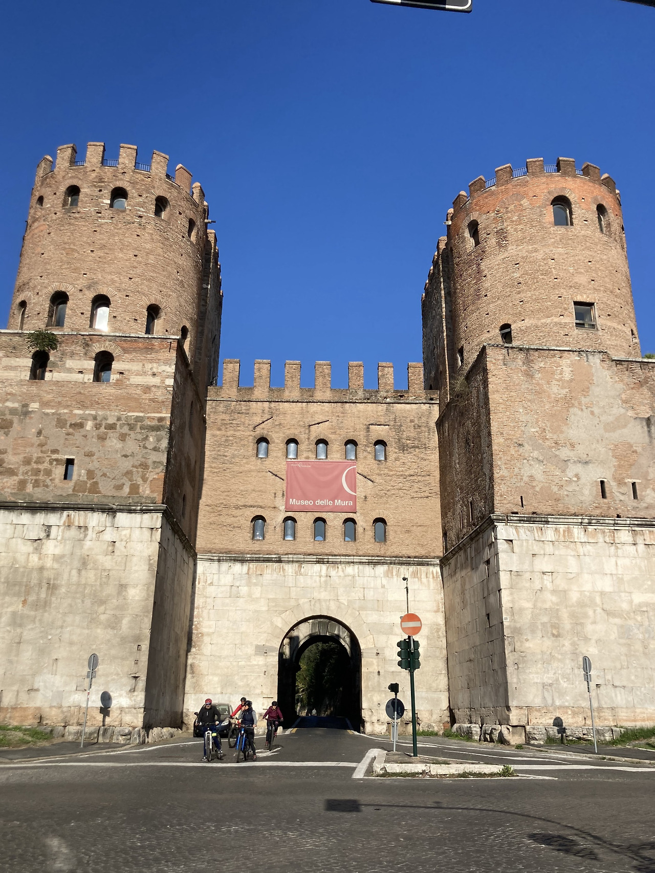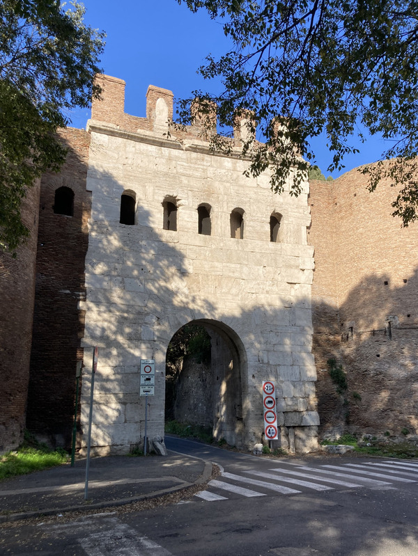 이 성문을 나와 직선으로 가면 성 밖의 바오로 대성당으로 향하게 됩니다. 걸어가는 길은 오스티엔세 길이라고 부르며 로마 서쪽 피우미치노 공항 근처에 있는 오스티아와 연결시켜 만든 고대 로마의 길입니다. 오스티아라는 도시는 고대 로마 시절 테베레 강으로 연결되어 있어 로마의 항구 위성도시 역할을 하였고, 아직도 이곳에는 폼페이에서 볼 수 있는 유적과 같은 건물과 길들이 남아있습니다.