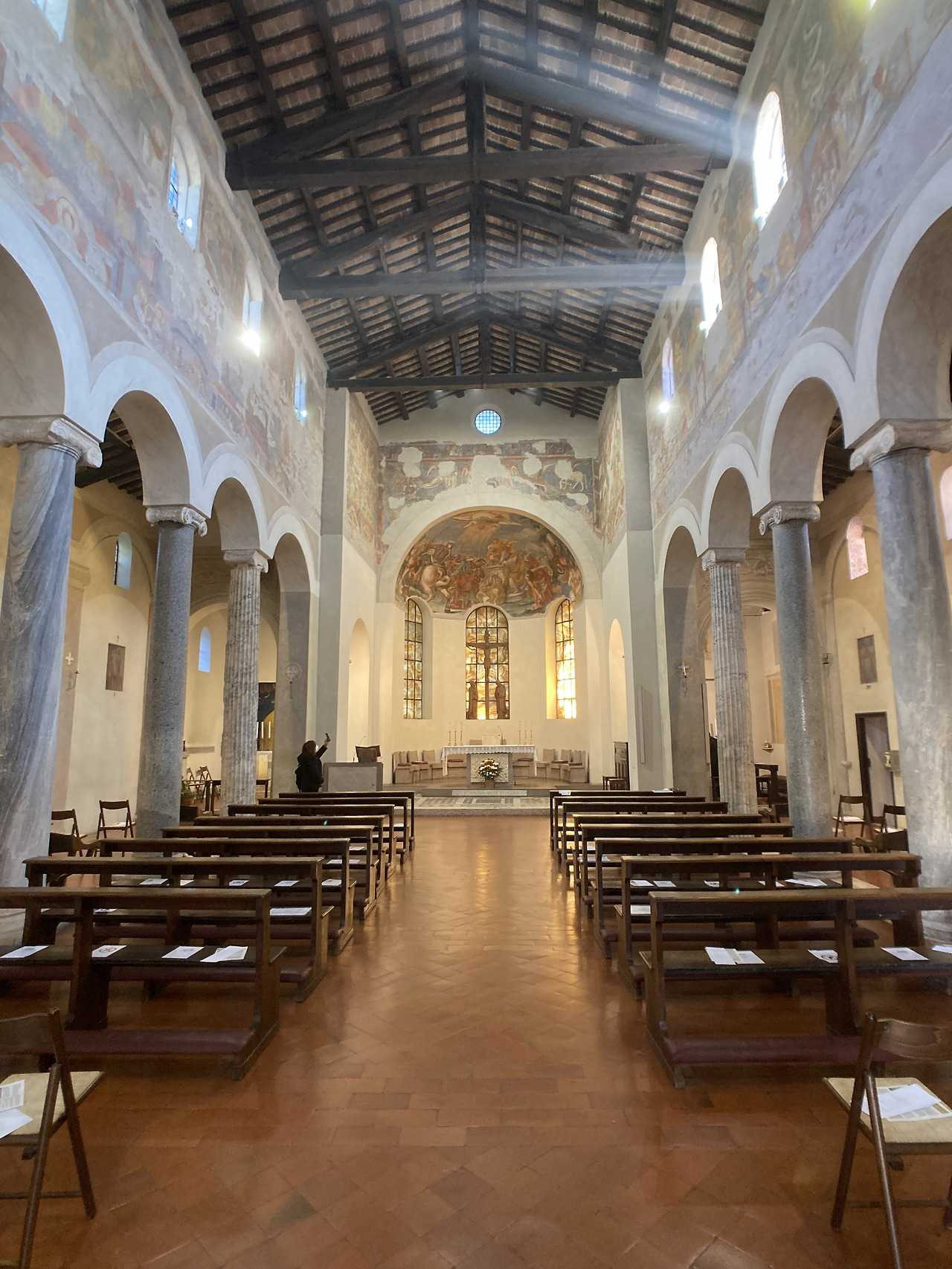 아마도 여기에 나오는 '스테파노'라는 이름은 이 문장을 우물에 새긴 사람의 서명일 것입니다. 우물 양옆에는 4세기 때의 주두를 가지고 있는 두 개의 기둥이 놓여 있습니다. 성당 내부로 들어가기 전 세 개의 이오니아 양식과 한 개의 도리아 양식의 주두를 가지고 있는 네 개의 기둥으로 바쳐져 있는 열린 현관은 '나르테체' (NARTECE)라고 불렀고, 이 장소는 하느님 집에 들어가기 전 자신이 합당한 상태인지 양심 성찰을 먼저 하는 곳이었습니다. 종탑은 12세기 때에 만들어진 로마네스크 양식이고, 1723년도에 만들어진 종이 아직도 울려 퍼지고 있습니다. 성당 내부는 비록 많이 훼손되어 알아볼 수 없는 프레스코화도 있지만 1191년도에 그려진 창세기 내용과 신약의 예수님 이야기가 있고, 성당문을 나가기 전 문 위의 벽면에는 하느님 집을 나가서도 올바로 살아야 한다는 경고로서의 최후의 심판 그림이 그려져 있습니다.