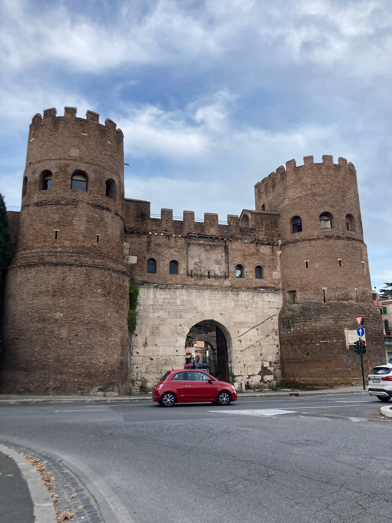 콜럼버스 길을 들어서니 저 멀리 로마 성벽이 보이기 시작합니다. 수개월을 걸어온 순례자들에게 멀리 보이기 시작한 이 성벽은 그들에게 어떠한 생각이 들게 하였을까요? 제대로 먹지도 못하고 도적이나 맹수들의 위협 속에서 목숨 걸고 도착한 이 로마 성벽은 아마도 그들에게 천상의 예루살렘 성벽을 보는 것 같은 느낌이었을 것입니다. 그런 성벽을 바로 아래에서 걷다 보면 제일 먼저 드는 생각은 1700년이나 지나도 튼튼하게 남아있는 성벽의 무게감입니다. 3세기 때에 만들어진 아우렐리우스 성벽은 로마를 보호하기 위한 목적이었고 총길이 19km를 가지고 있습니다. 이 성벽은 로마 제국의 땅 안에서 심장과도 같은 역할을 하였습니다. 왜냐하면 성벽과 연결된 문을 통해 그 유명한 로마의 가도들이 로마가 점령한 위성도시들과 연결되어 제국의 모든 곳을 하나의 몸처럼 살아있게 하였기 때문입니다.