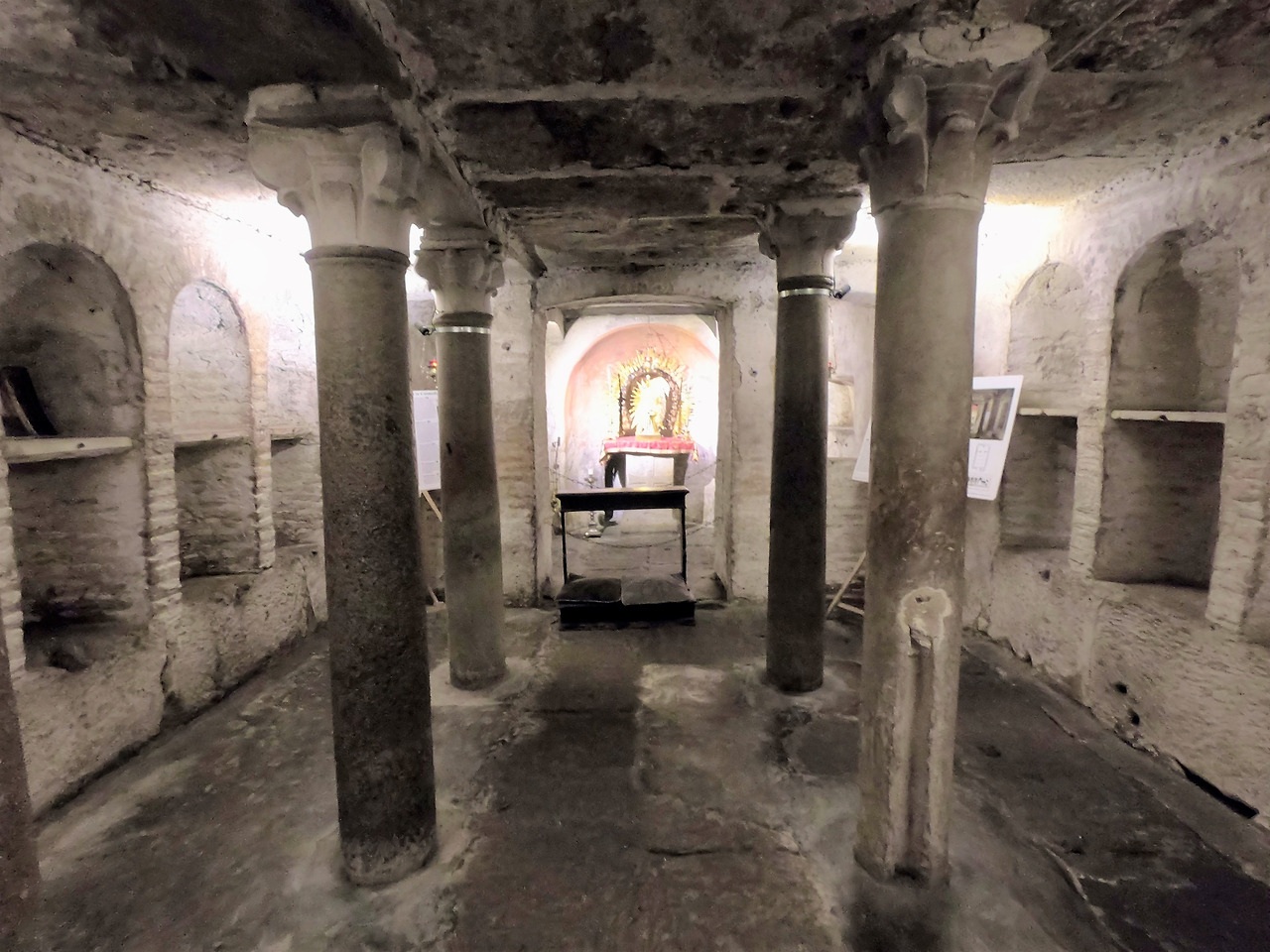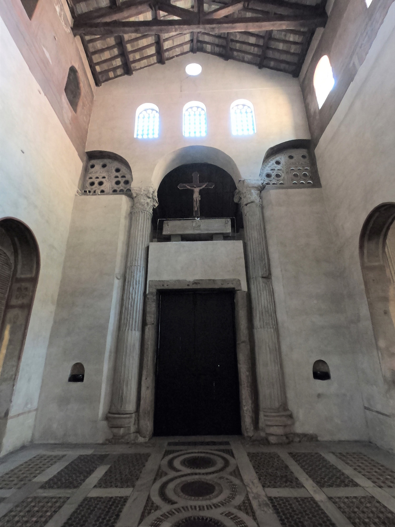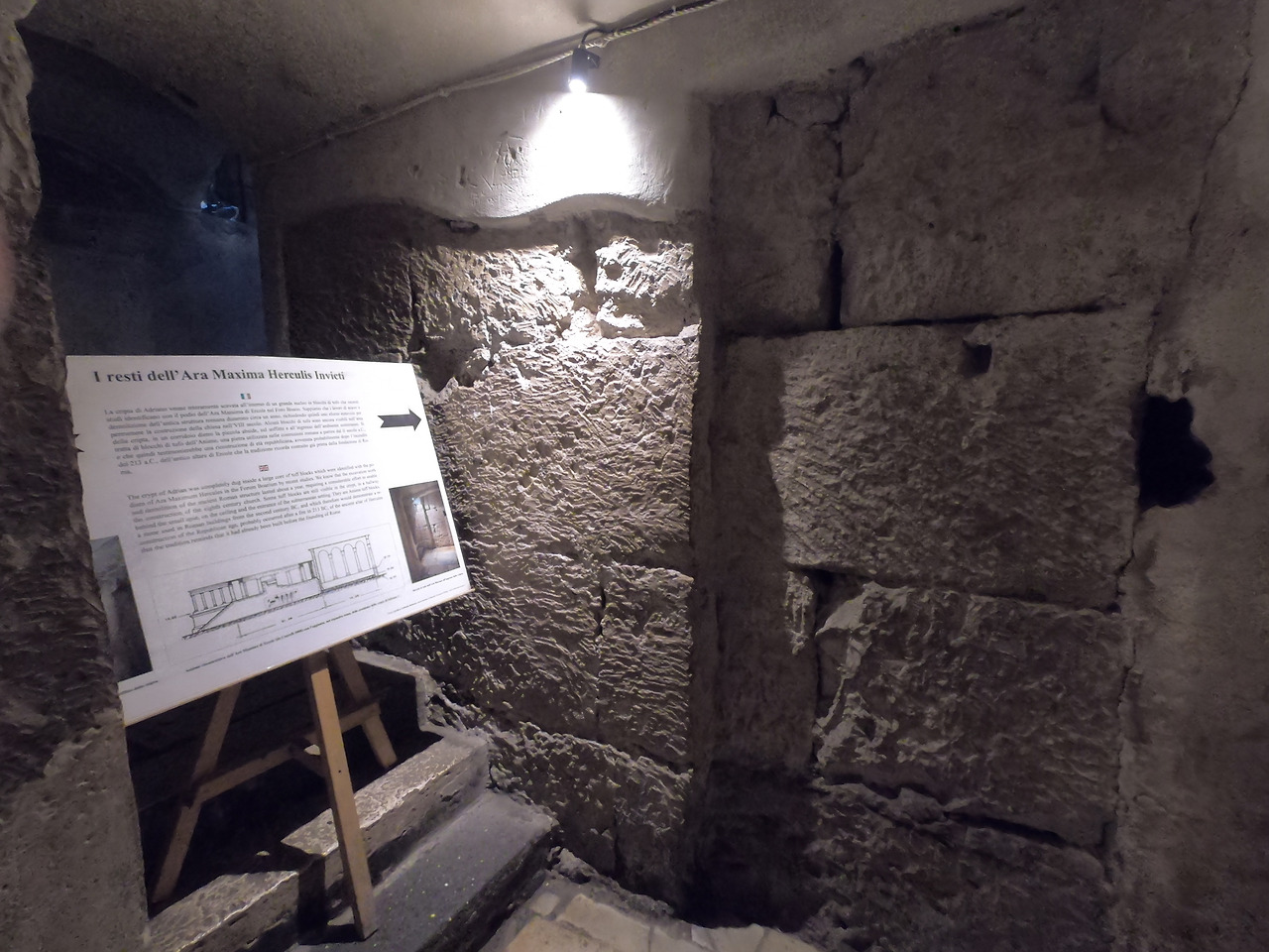 그리고 이 로마 시대 건물 옆에는 헤라클레스에게 봉헌한 위대한 제단 (Ara Massma Ercole)이 있었고, 이 제단에 사용된 거대한 블록의 돌들은 현재 성당 제단 밑에 있는 크립타의 일부 벽에서 볼 수 있습니다. 그리고 이 크립타는 아드리아노 1세 교황 (재위 772-795) 때 만든 것으로, 반원형 천장을 가지고 있지 않은 로마에서 유일한 지하 소성당입니다. 정면 압시대에는 6세기 제단이 남아 있고 양옆 벽감에는 순교 성인들의 유해나 유물을 모셨던 자리입니다.