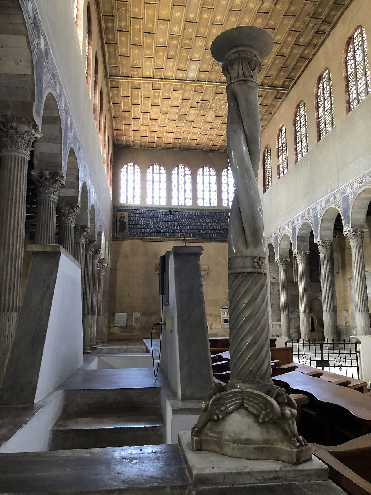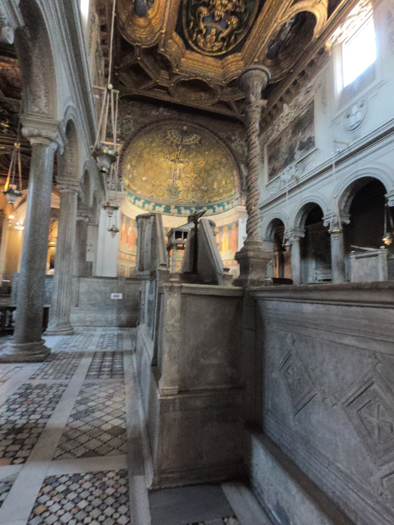 이런 전례적 방향과 성서적 상징성을 잘 보여주는 성당이 이 코스메딘의 성모 마리아 성당이라고 할 수 있습니다. 성당 내부로 들어가면 칼리스토 2세 교황 (1119-1124) 때 네 면을 벽으로 쌓아 올려 만든 스콜라 칸토룸 (Schola cantorum)이라는 생소한 공간을 볼 수 있습니다. 이 장소는 지금의 성가대가 사용하는 자리와 비슷한 장소로써, 전례 중에 신자들이 성가나 시편을 잘 따라 부를 수 있도록 앞부분의 음을 잡아주던 사람들이 사용한 곳이기도 하지만 예수님의 부활을 믿고 찬미하는 자리이기도 하였습니다. 그래서 이 장소는 하와와 아담이 살았던 에덴 정원을 상징하였으며, 죄를 지어 쫓겨나는 곳이 아니라 죽음을 이기신 예수님 무덤이 있던 장소였습니다.