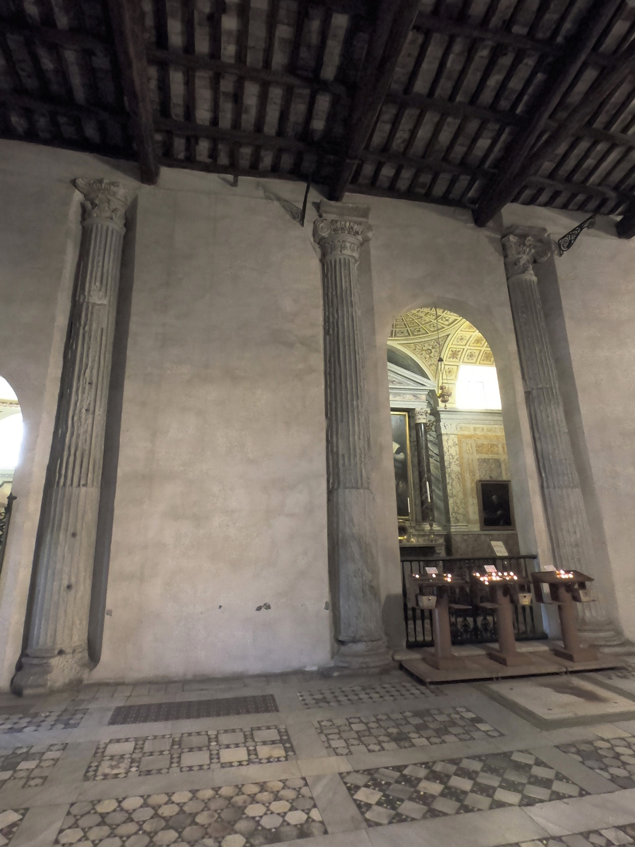 그래서 6세기에 이 성당이 지어진 자리에는 원래 기원후 2세기경에 지은 로마 시대 건물이 있던 곳입니다. 이 건물은 두 개로 나누어져 있었는데, 하나는 사람들에게 음식 재료를 나누어 주던 곳이었고 나머지 하나는 헤라클레스에게 봉헌한 자리였다고 합니다. 이때 사용되었던 건물 기둥들은 지금도 그 자리에서 성당의 기둥으로 사용되고 있고, 일곱 개는 성당 뒤편에, 나머지 세 개는 성당 왼쪽 벽에서 볼 수 있습니다.