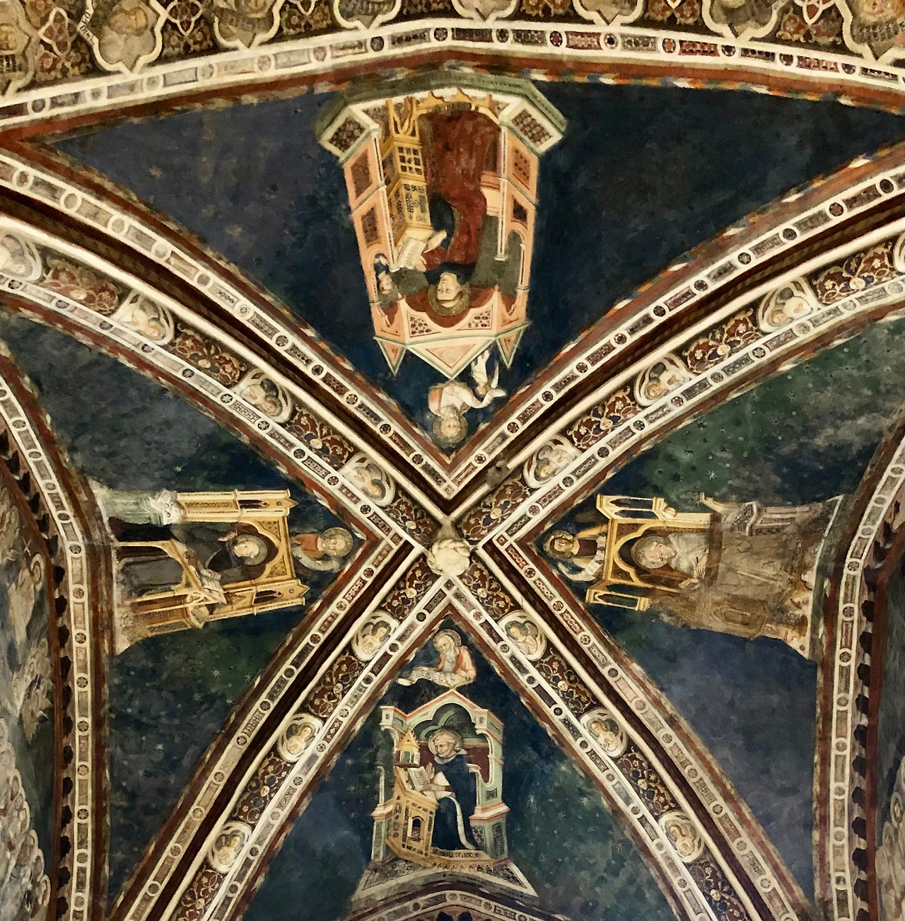 이 그림들의 천장에는 서방의 4대 교부인 암브로시오, 아우구스티노, 그레고리오 대 교황, 예로니모 성인과 상체만 보이는 복음사가의 모습이 있습니다 (그림 5).
