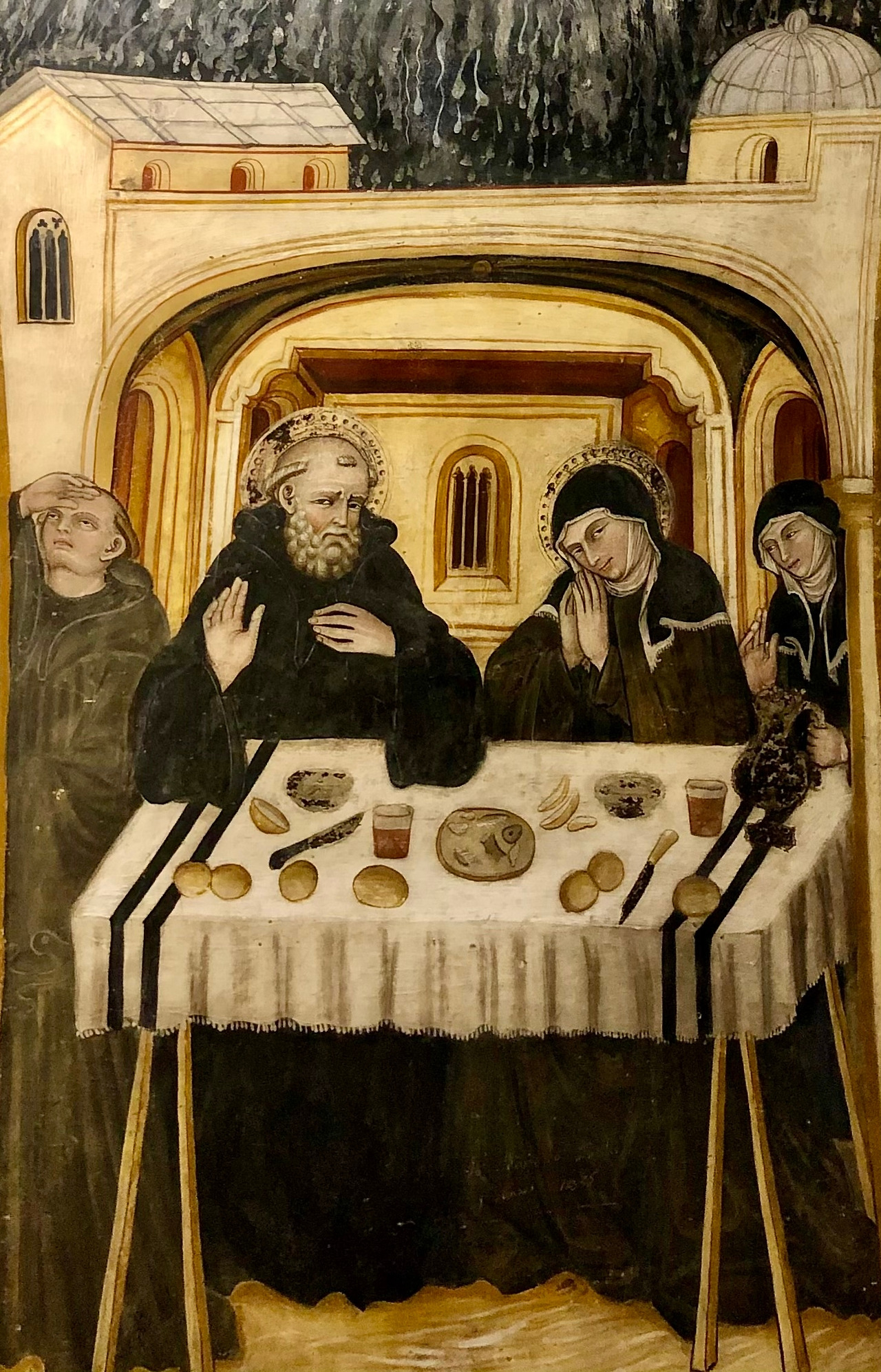 성인께서는 1년에 한 번 수도원 근처의 집에서 동생과 만나 이야기도 나누고 식사도 하였다고 합니다. 해가 저물기 시작하자 여느 때와 같이 성인은 자리에서 일어나 수도원으로 돌아가려고 했는데, 이날은 이상하게도 스콜라스티카가 성인에게 천상의 삶과 기쁨에 대해서 아침까지 이야기를 더 해달라고 청했다고 합니다. 하지만 모든 수도자들이 지켜야 할 규칙을 만들었던 수도 원장으로서 베네딕도는 눈살을 찌푸리며 손사래까지 치며 거절합니다 (그림 11). 그러자 스콜라스티카는 오빠를 바라보지도 못하고 머리를 숙이고 있습니다. 그리고 두 손 모아 오빠가 이곳에 좀 더 머물면서 자기와 사랑의 대화를 나눌 수 있도록 허락해 달라고 하늘로 눈길을 보내며 예수님께 자기의 마지막 기도를 드립니다. 그러자 베네딕도 오른쪽에 있는 한 수도자가 손을 이마에 대고 하늘을 쳐다보고 되고, 맑았던 하늘에 갑자기 먹구름이 끼고 천둥소리를 내며 비가 쏟아지기 시작합니다.