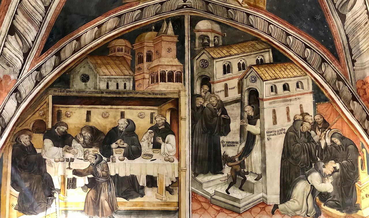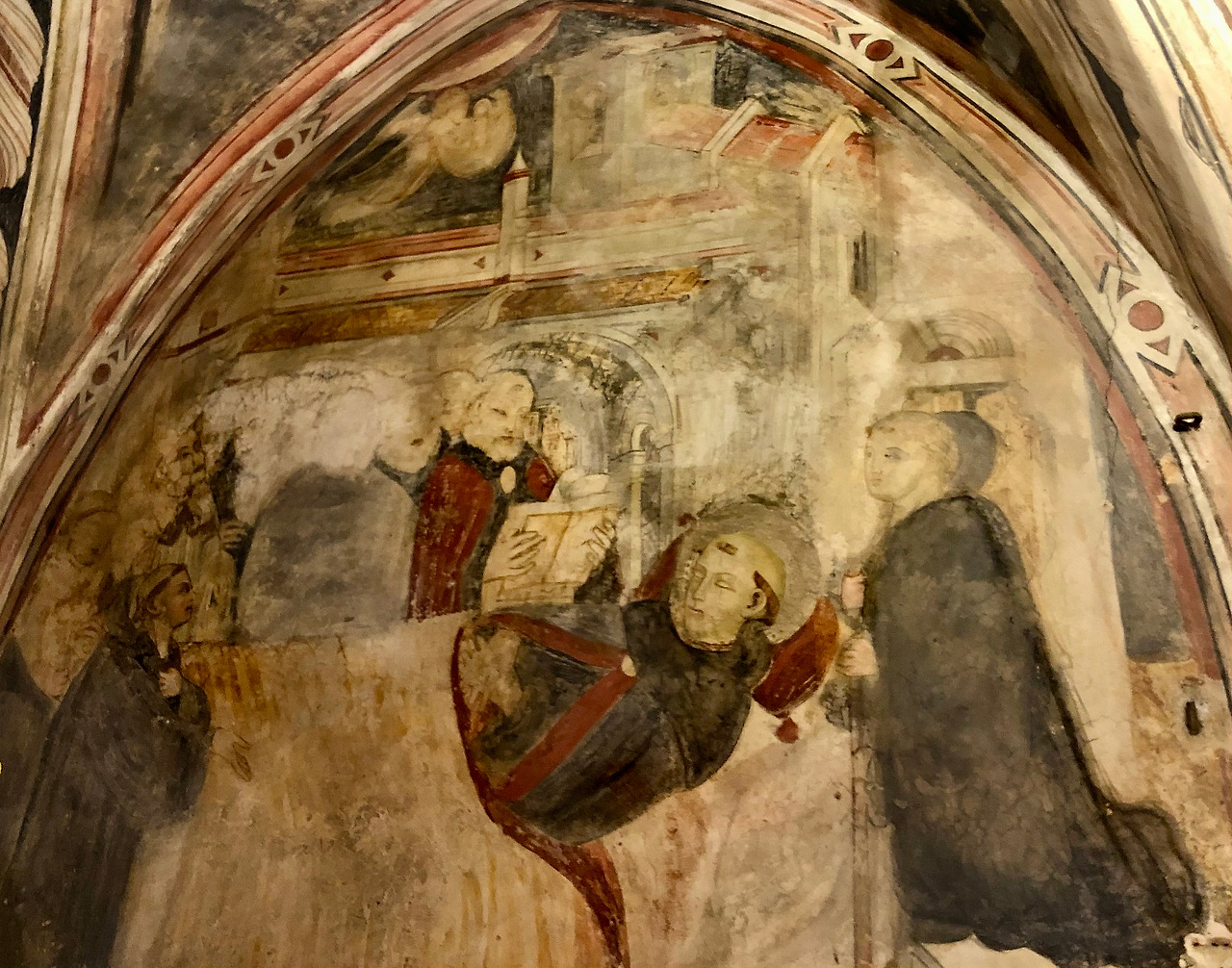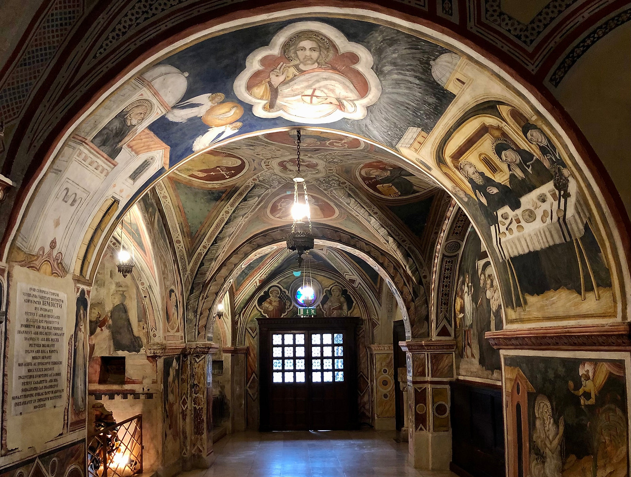 조금 안쪽으로 들어가면 15세기 초 움브리아 지방 마르케 학파 화가들이 그린 베네딕도 성인의 이야기가 있습니다. 왼쪽 벽의 그림은 절벽 쪽에 있는 부분이라 습기에 많이 훼손되었지만, 그래서 색 바랜 이 벽화의 내용을 더 신비롭게 해주는 것 같습니다.
