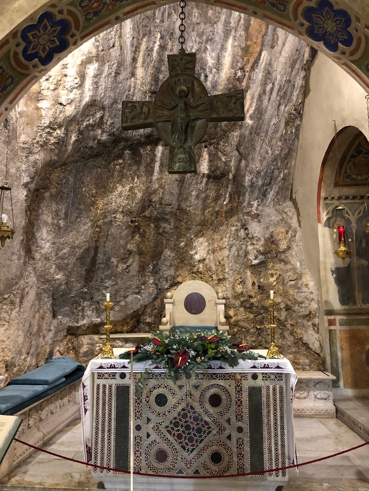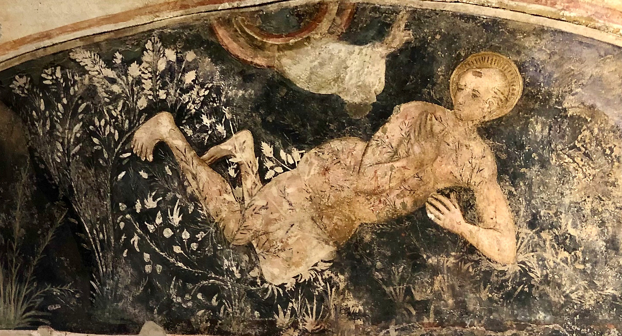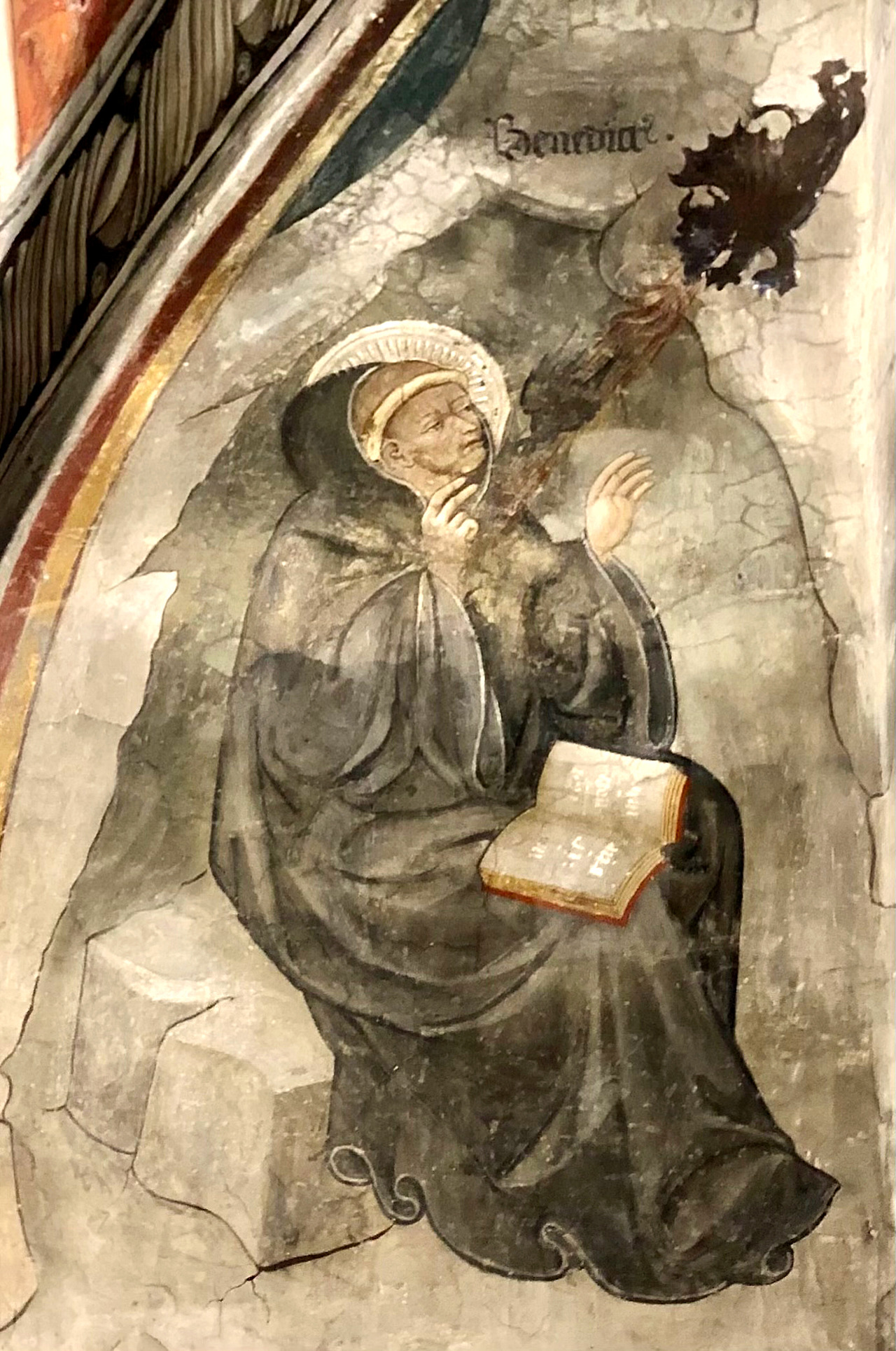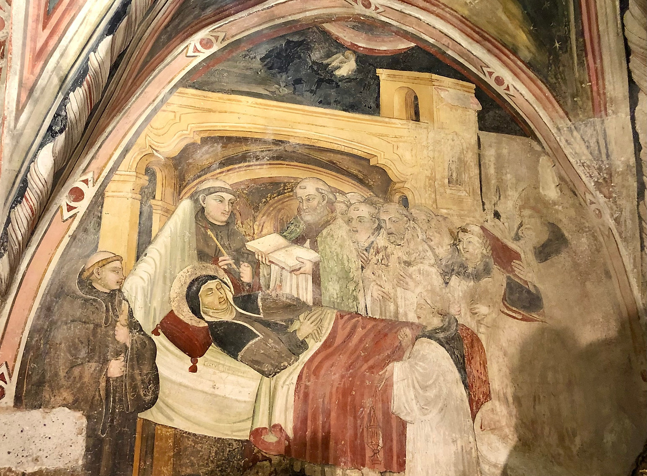 조금 안쪽으로 들어가면 15세기 초 움브리아 지방 마르케 학파 화가들이 그린 베네딕도 성인의 이야기가 있습니다. 왼쪽 벽의 그림은 절벽 쪽에 있는 부분이라 습기에 많이 훼손되었지만, 그래서 색 바랜 이 벽화의 내용을 더 신비롭게 해주는 것 같습니다.