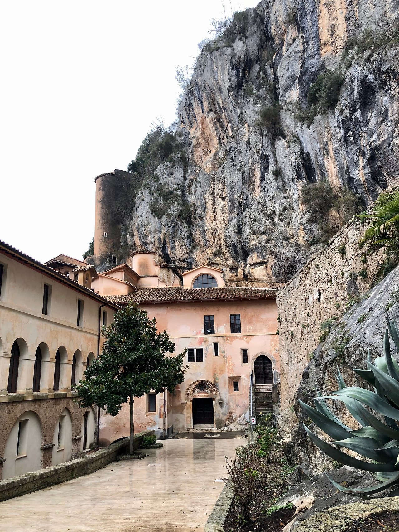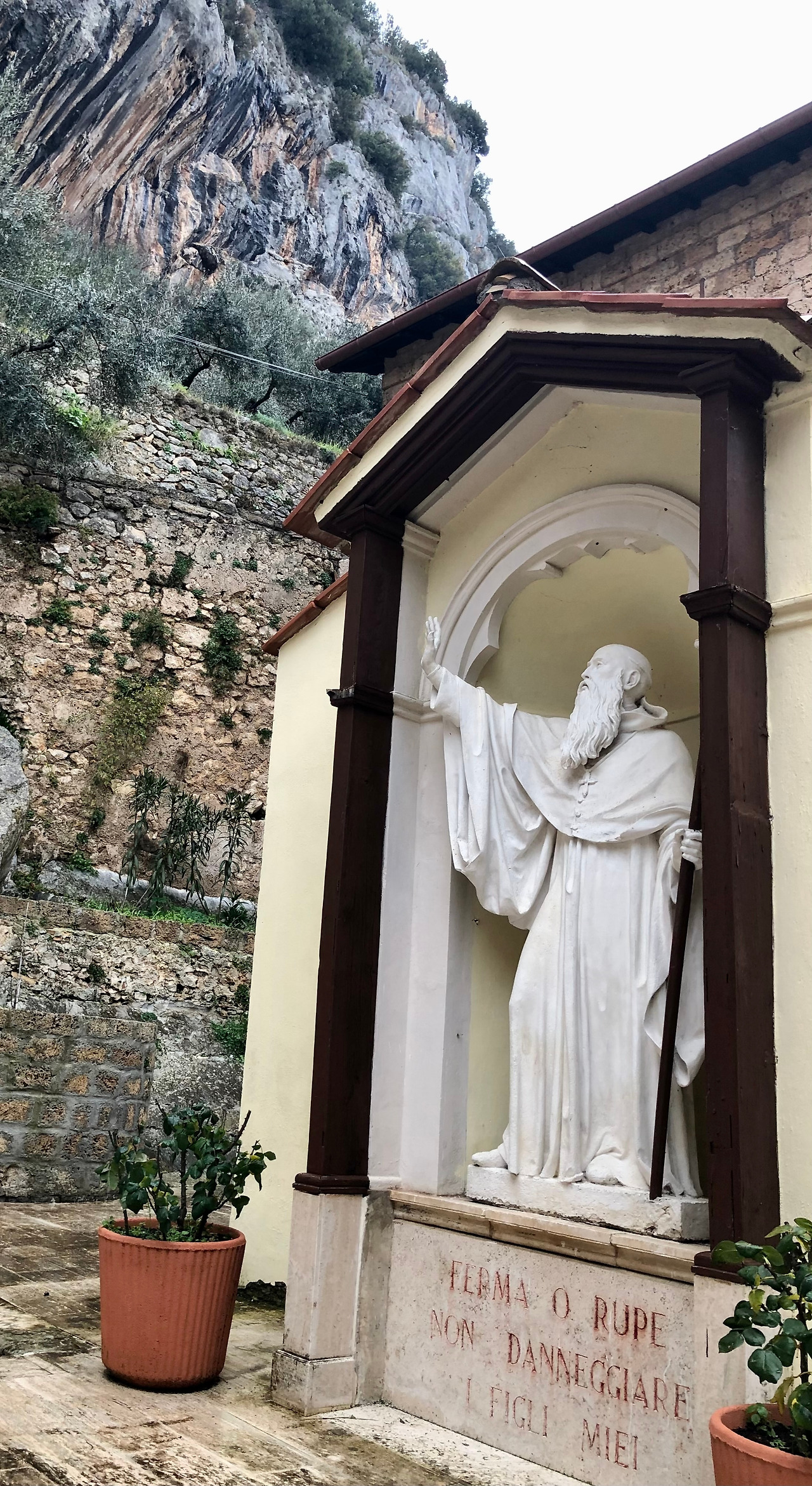 수도원과 성당을 덮칠 듯이 펼쳐져 있는 절벽을 향해 오른손을 들어 막고 있는 베네딕도 성인의 석상을 볼 수 있고, 그 받침대에는 ‘절벽아 멈추어라. 나의 아들들을 해치지 말라’라고 쓰여 있습니다. 낙석을 방지하는 안전 장치들이 하나도 없는 것을 보면서 베네딕도의 기적이 정말 있는 것인가라는 생각도 들었지만, 이곳 절벽을 머리 위에 두고 매일 살고 있는 수도자들의 믿음이 더 크게 느껴졌습니다.