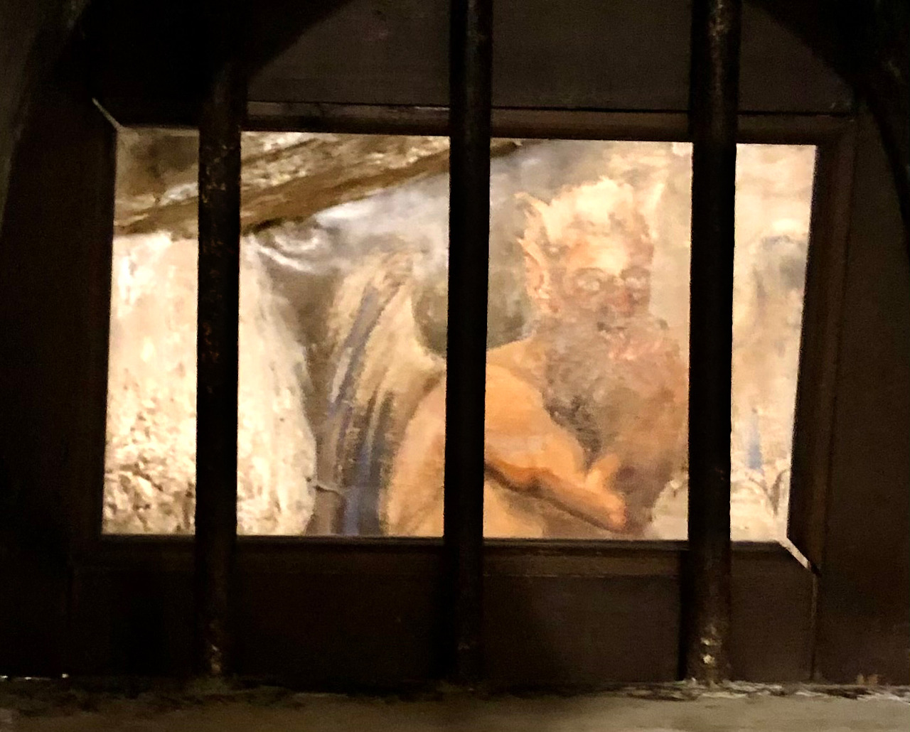 잘못에 대한 벌과 사람에 대한 용서는 같이 이루어져야 한다는 것을 보여줍니다. 여기서 성인께서 때린 것은 규칙을 어긴 수도자가 아니라 사실 그 마음 안에 들어가 수도 생활을 괴롭히는 사탄이었습니다. 그 이유를 설명하듯 반대편 쪽을 보면 수도자의 마음에서 쫓겨난 사탄의 모습이 그려져 있습니다. 창문 사이로 성인에게 매를 맞아 놀란 모습으로 성인을 바라보며 바위에 숨어 떨고 있는 사탄이 재미있기도 하지만 한편으로는 통쾌한 느낌마저 들게 합니다 (아래 사진 9).