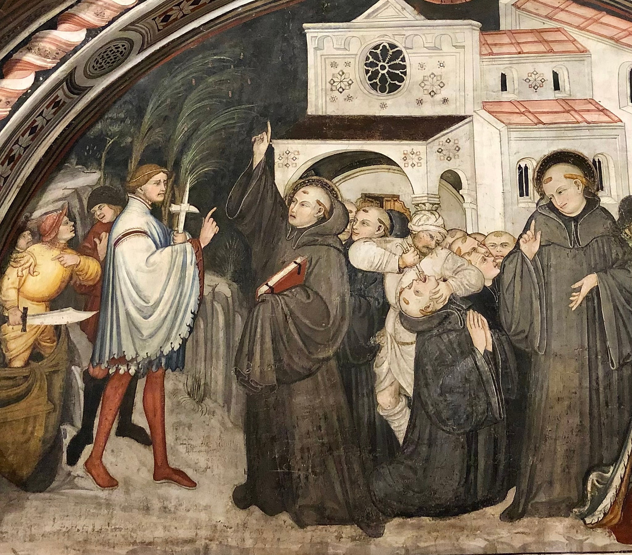 반대편 쪽 두 개의 반달형 벽에는 베네딕도의 또 다른 수제자인 플라치도가 시칠리아에 있는 메씨나 도시에서 설교를 하는 장면이고, 이로 인해 혀를 뽑혀 순교를 하는 장면입니다 (그림 12).