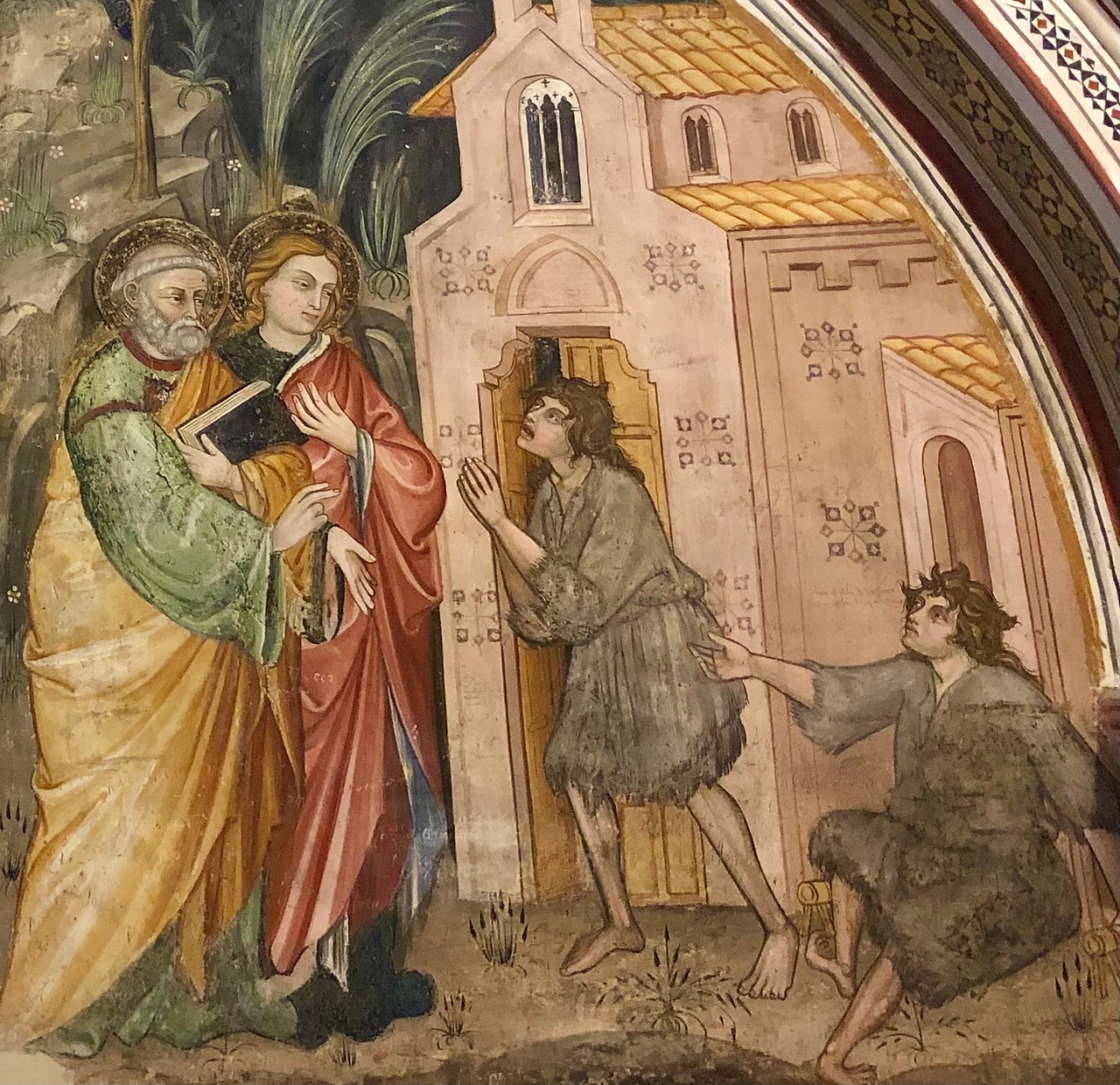 다음 (그림 13)은 성 요한과 베드로가 예수님의 이름으로 앉은뱅이를 기적적으로 일으켜 세우는 장면입니다. 이 그림을 보고 있으면 500년 전 동영상을 보고 있는 듯합니다. 앉은뱅이를 서있는 사람과 앉아있는 동일한 인물로 그려 넣음으로써 내 눈앞에서 그때의 기적을 보는 듯합니다.
