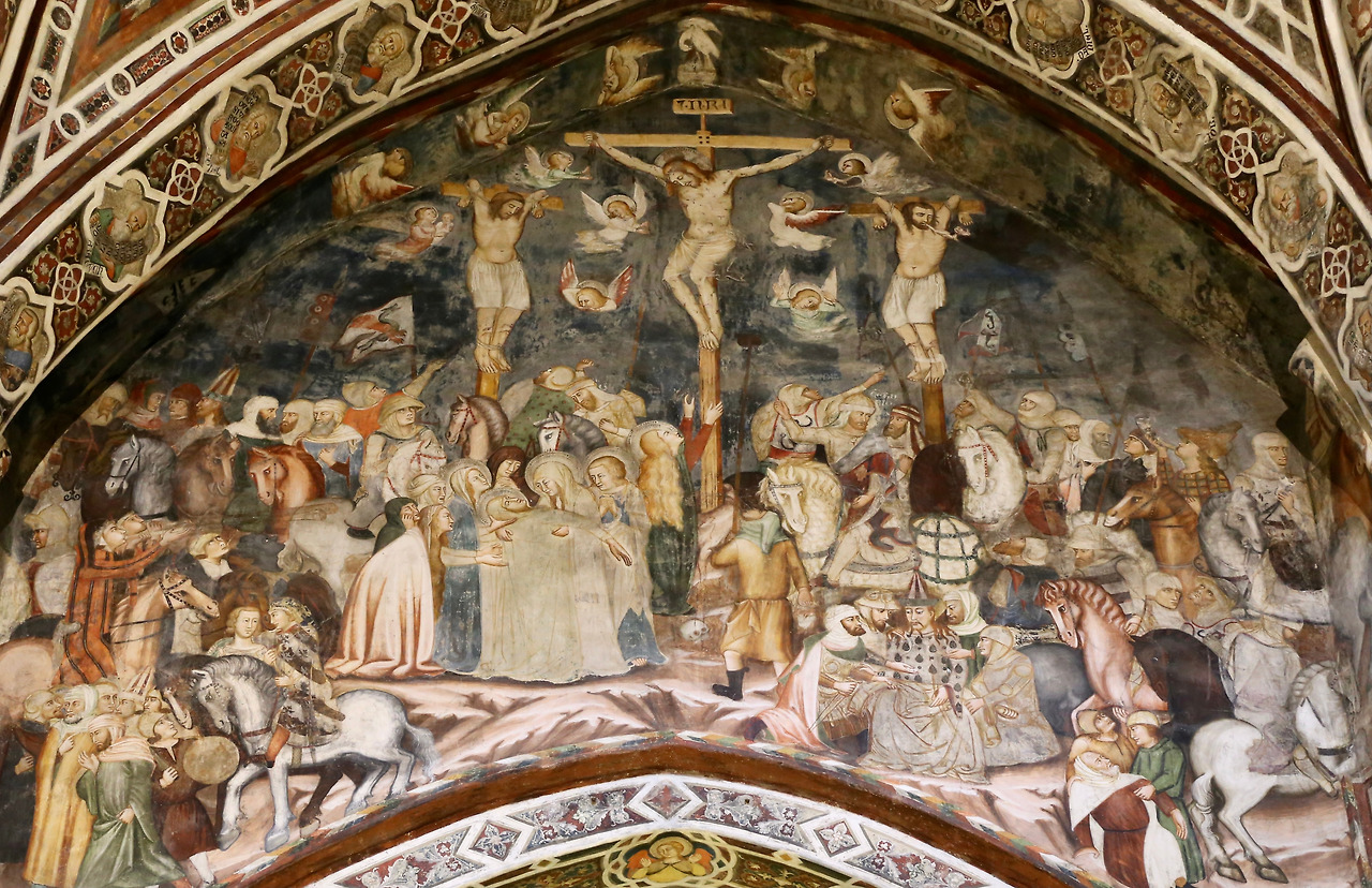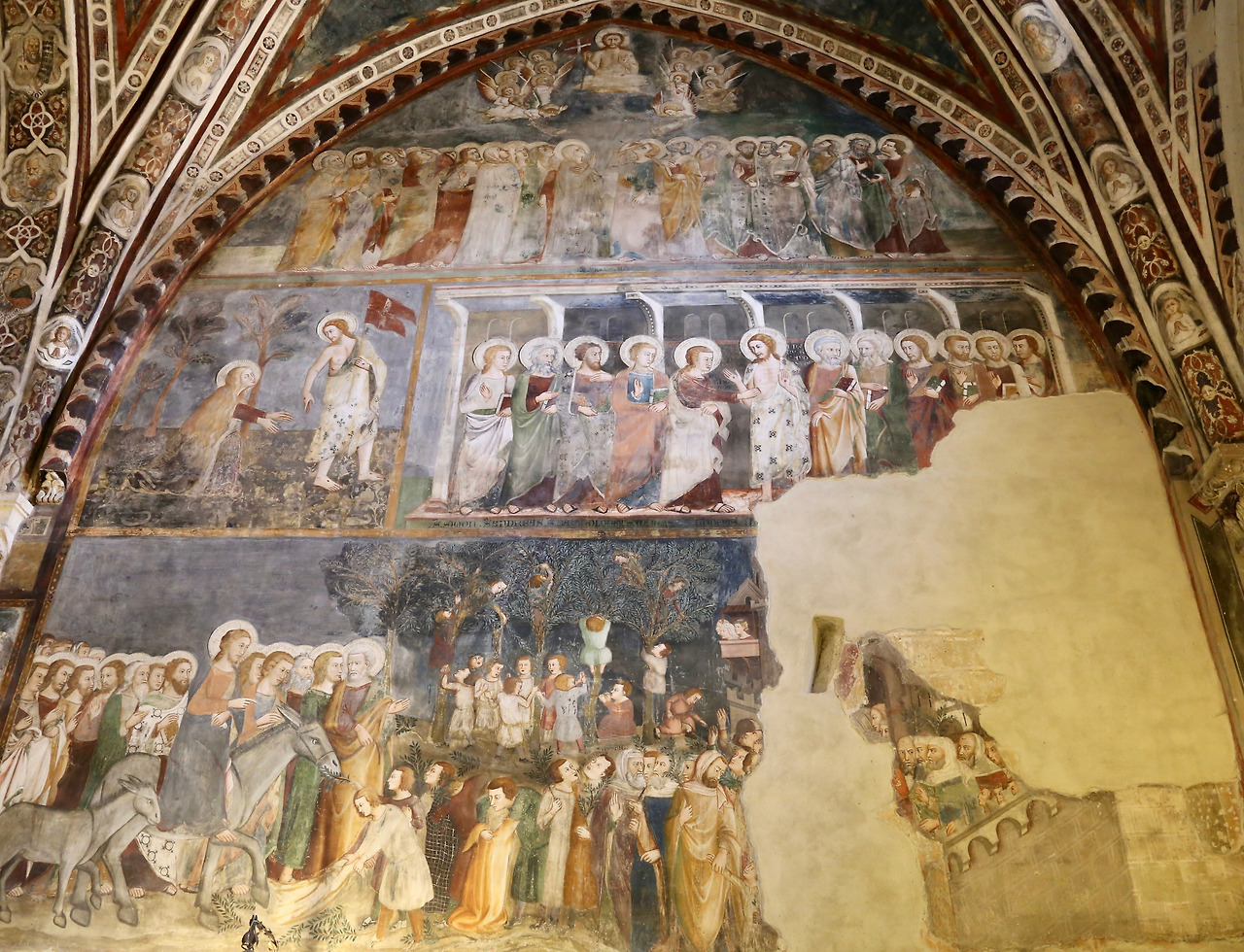 위층 성당의 절반은 예수님의 이야기, 나머지는 베네딕도 성인의 이야기를 그림으로 보여주고 있습니다. 예수님의 이야기는 14세기 초반에 시에나 학파에 의해서 그려졌고 예수님의 예루살렘 입성부터 사도들에게 내려오는 성령 강림까지의 장면들입니다.