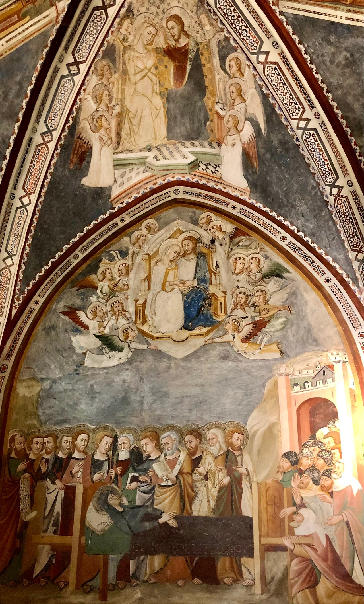 제대가 있는 정면 벽에는 성모의 죽음이 그려져 있습니다 (그림 27). 성모 주변에는 열두 사도들이 임종을 지키고 있는데 오른쪽 문을 통해 성모의 유해를 훼손시키려는 유다인들이 몰려들어오고 있습니다. 하지만 이런 나쁜 마음을 품고 들어온 이들은 성모를 보자마자 눈이 멀었고, 침대를 들고 성모의 유해를 훔쳐 가려했던 사람들은 앉은뱅이가 되어 버립니다. 결국 마리아는 온전하게 하늘로 들어 올려져 왼손을 예수님 어깨에 얹고 기댄 채 편안히 있게 됩니다. 계속해서 그 위 천장으로 보면 예수님으로부터 천상 모후의 관을 받으시는 장면입니다.