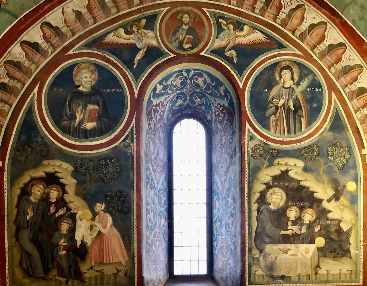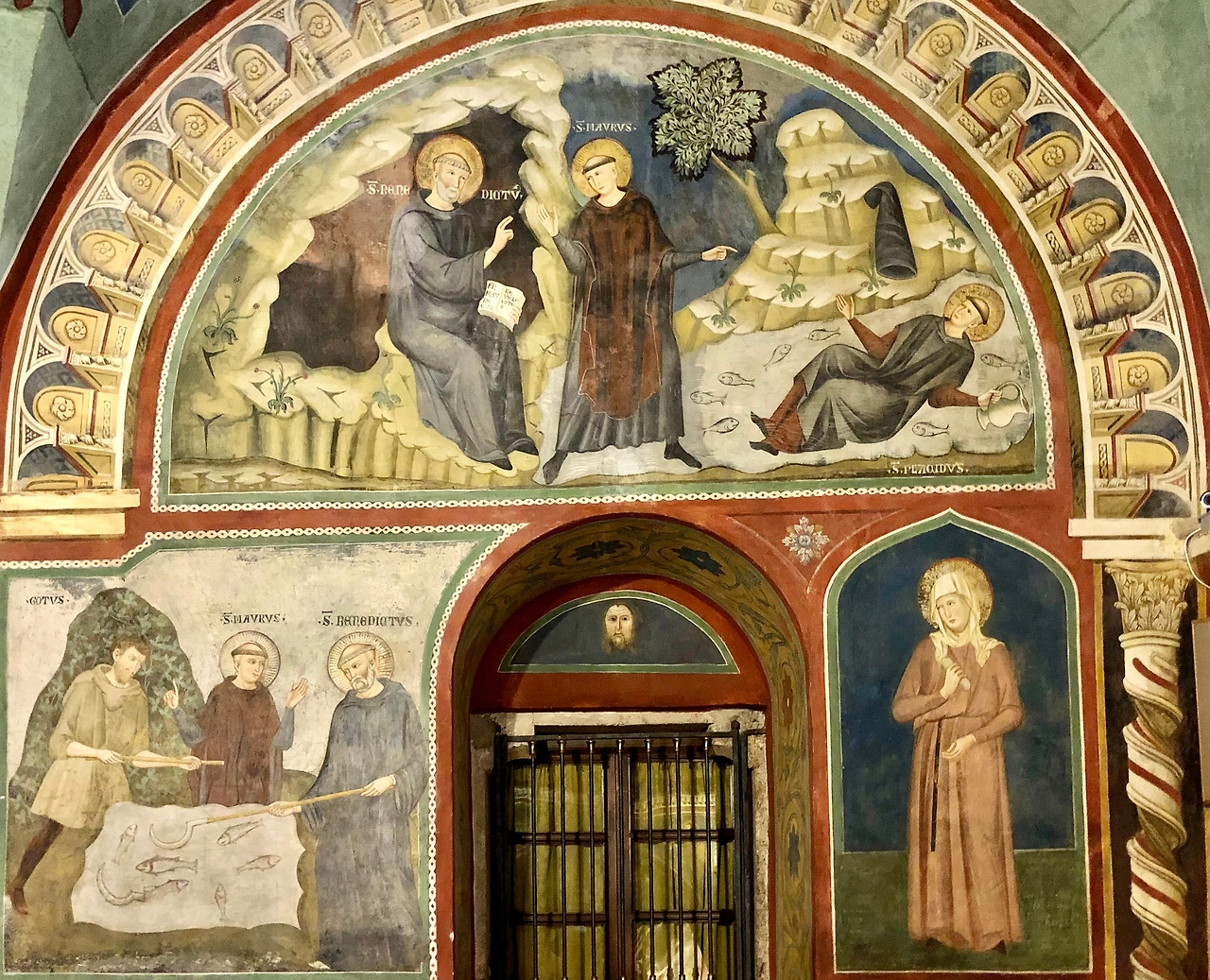 교황이 들고 있는 문서는 1203년에 반포한 교서이고, 이 내용 안에 거룩한 동굴 수도원의 수입을 지정하고 있습니다. 교서 왼편에는 베네딕도와 그 앞에 무릎을 꿇고 있는 로마노 (+1216) 수도원장입니다. 이 교서 그림은 몇 년 전까지 베네딕도의 다른 그림으로 덮혀진 프레스코화가 있었고, 그것을 떼어내어 지금은 제의방에 옮겨놨습니다. 이 교서 오른쪽에 등장하는 교황도 인노첸시오 3세의 모습이고 이것은 콘솔루스 (Conxolus)라는 화가가 그렸습니다. 이 화가에 대해서는 알려진 것은 거의 없지만, 13세기 중반 로마 학파에 속해 있었던 사람이었고 이 수도원 아래층 성당의 베네딕도 성인의 생애 대부분을 그림을 직접 그린 사람입니다.