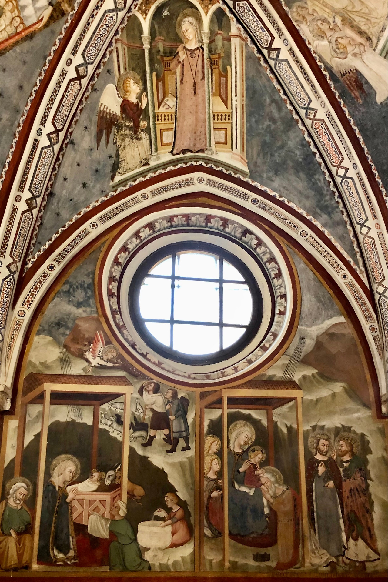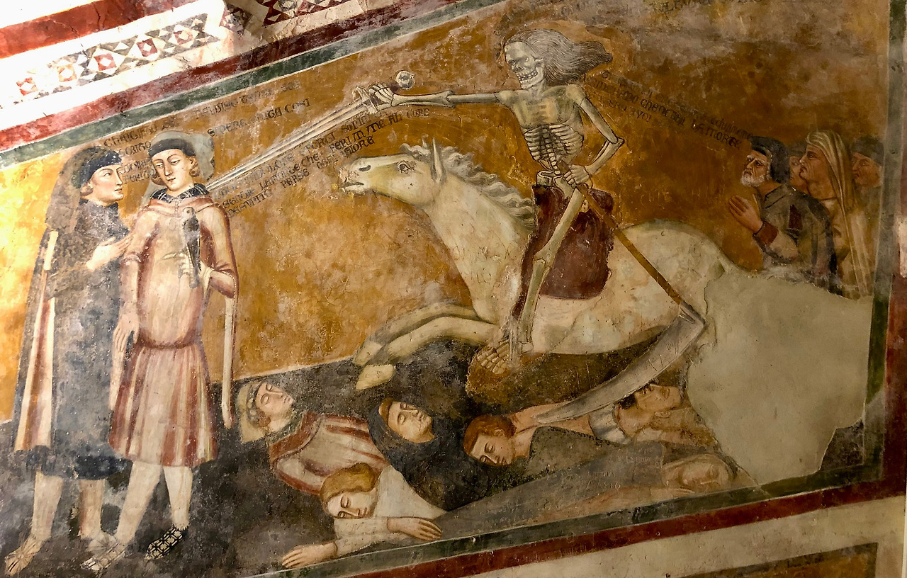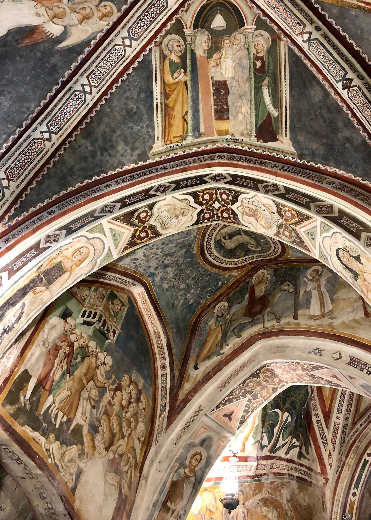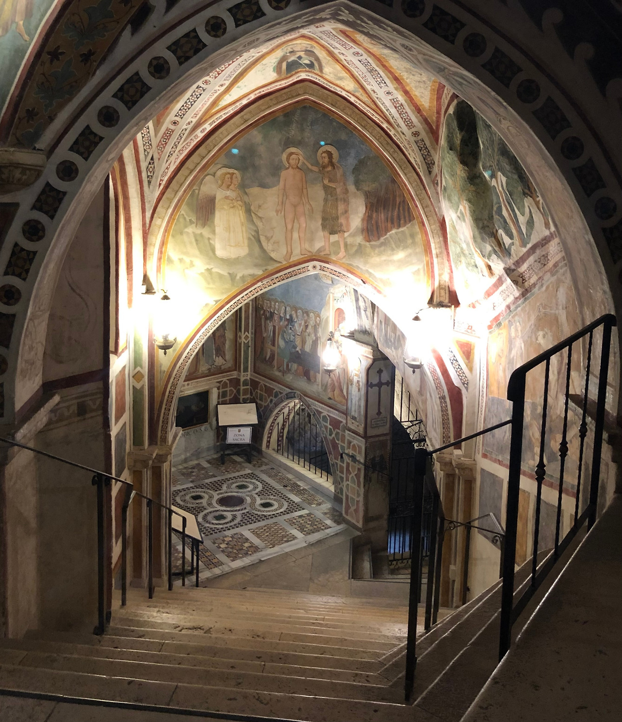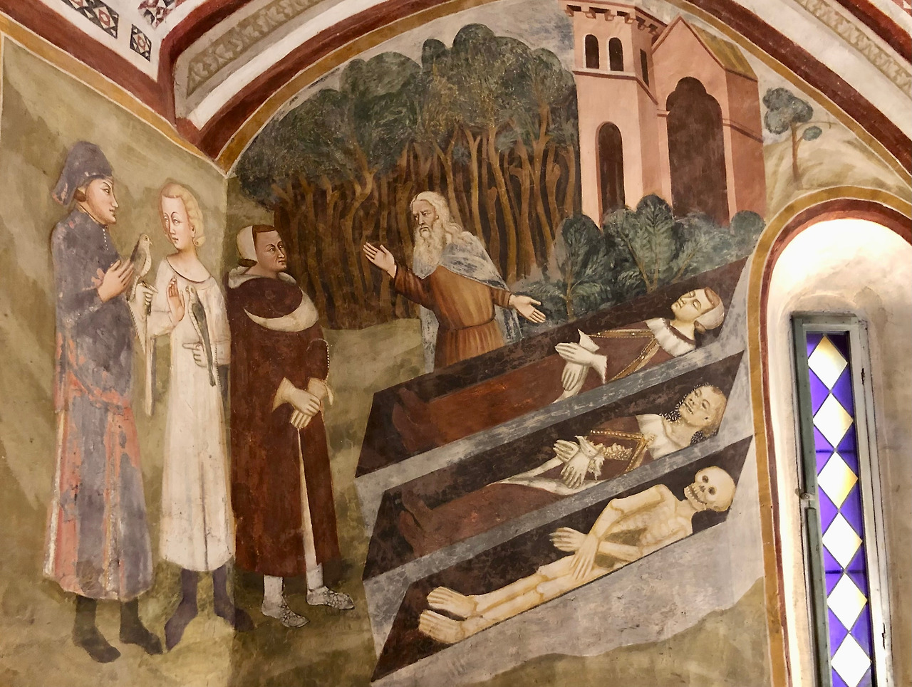 거룩한 계단의 양옆 그림의 주제는 ‘죽음의 승리’입니다. 이 그림들도 위층 성당 예수님의 생애를 그렸던 시에나 학파 사람들이 14세기 중반에 그린 것으로써 이 시기에는 죽음에 대한 무력감을 많이 느끼던 시기라고 할 수 있습니다. 십자군 전쟁에서의 가톨릭 교회의 패배와 연이어 1348년도에 전 유럽을 휩쓸었던 흑사병 앞에서 나의 사랑하는 가족과 이웃이 힘없이 죽어가는 모습 속에서 죽음은 누구도 막을 수 없는 강한 존재라고 느끼던 때였고, 이 죽음의 두려움과 결부되어 최후의 심판의 그림도 이 시기에 그려지기 시작하였습니다. 오른쪽은 역동성 넘치는 죽음이 머리카락을 휘날리며 한 젊은이의 목에 칼을 꽂고 있고, 그 뒤에 노인들은 단지 기도만 할 뿐입니다 (그림 23). 왼쪽 벽에는 나이 든 수도자가 젊은 청년에게 죽음 후에 몸이 어떻게 되어가는지를 설명하고 있습니다 (그림 24).