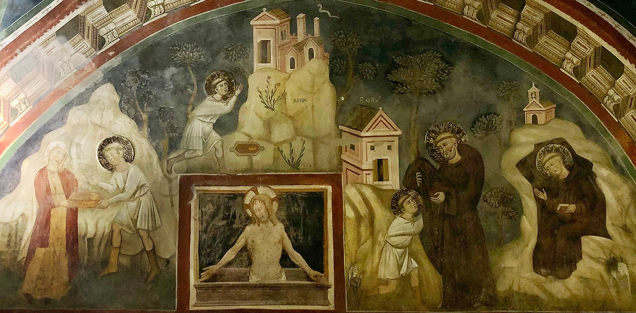 왼편에는 후에 그레고리오 9세의 이름으로 교황이 되는 우골리노 추기경이 이 소성당을 축성하는 그림이 있습니다. 추기경 뒤편으로 이 소성당 축성에 참석한 프란치스코의 모습도 볼 수 있습니다. 추기경은 프란치스코의 친구이자 절대적인 후원자이기도 하였습니다. 이 그림의 프란치스코에게도 역시 후광을 찾아볼 수 없어 살아있을 때 그려졌다고 생각할 수 있지만 그렇지 않습니다. 왜냐하면 그림 아래 라틴어로 쓰인 내용을 보면 ‘전에 오스티아의 추기경이었던 교황 그레고리오가 이 소성당을 축성하였다. 이 장소는 교황 재위 2년에 그려졌다’라고 기록되어 있는데, 그레고리오 9세 교황이 1227년에 착좌를 했고, 그렇다면 프란치스코가 선종한 1226년의 2년 뒤인 1228년도에 그려졌다는 얘기입니다. 다만 후광이 없는 이유는 프란치스코가 아직 성인품에 오르지 못했다는 것을 이야기하는 것입니다. 프란치스코는 그레고리오 9세 교황에 의해 다음 해인 1229년에 성인품에 오르게 됩니다.