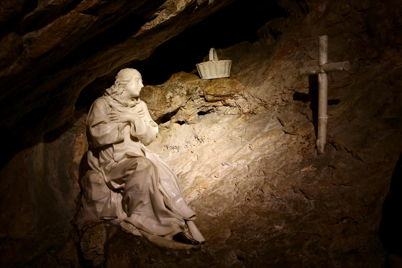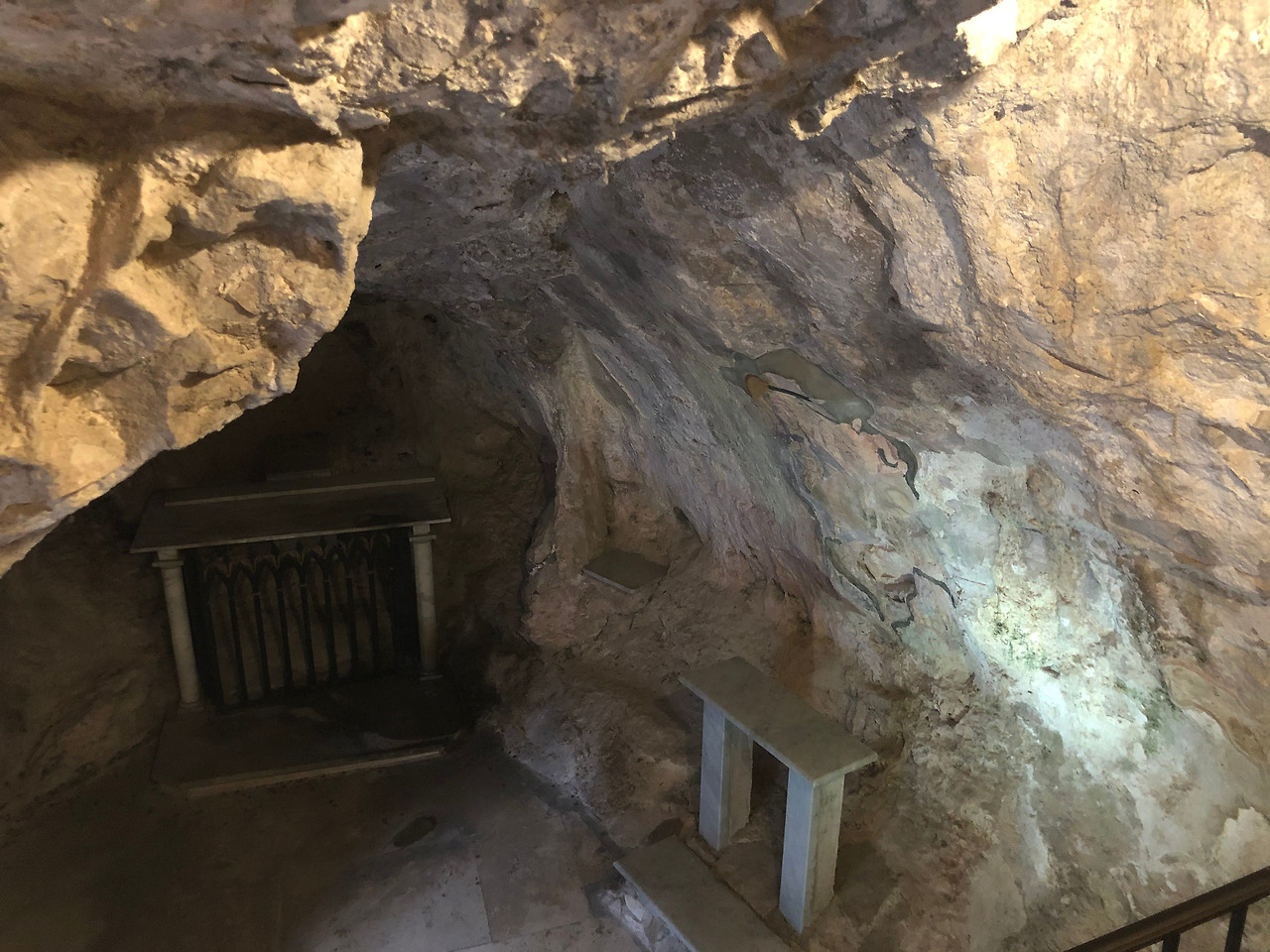 이 장소에서 수도원의 가장 중요한 곳인 베네딕도 성인께서 3년 동안 은수 생활을 하며 하느님을 기다리고 만났던 거룩한 동굴로 들어갈 수 있습니다 (그림 19). 이 동굴의 안내자이자 유일하게 베네딕도의 거처를 알고 있었던 로마노 수사는 베네딕도에게 필요한 음식을 바구니에 담아 절벽 위에서 내려주었다고 합니다. 이 이야기를 그려놓은 그림은 거룩한 동굴 뒤편 위에 그려져 있습니다. 13세기 때의 코스마 테스코 바닥이 있고 두 손을 가슴에 모아 십자가를 바라보며 하느님을 찾는 소년 베네딕도의 간절한 마음을 담은 대리석상을 볼 수 있습니다. 이것은 바로크 최고의 조각가인 베르니니의 제자 라지 (Raggi)에 의해 1657년에 만들어졌습니다.