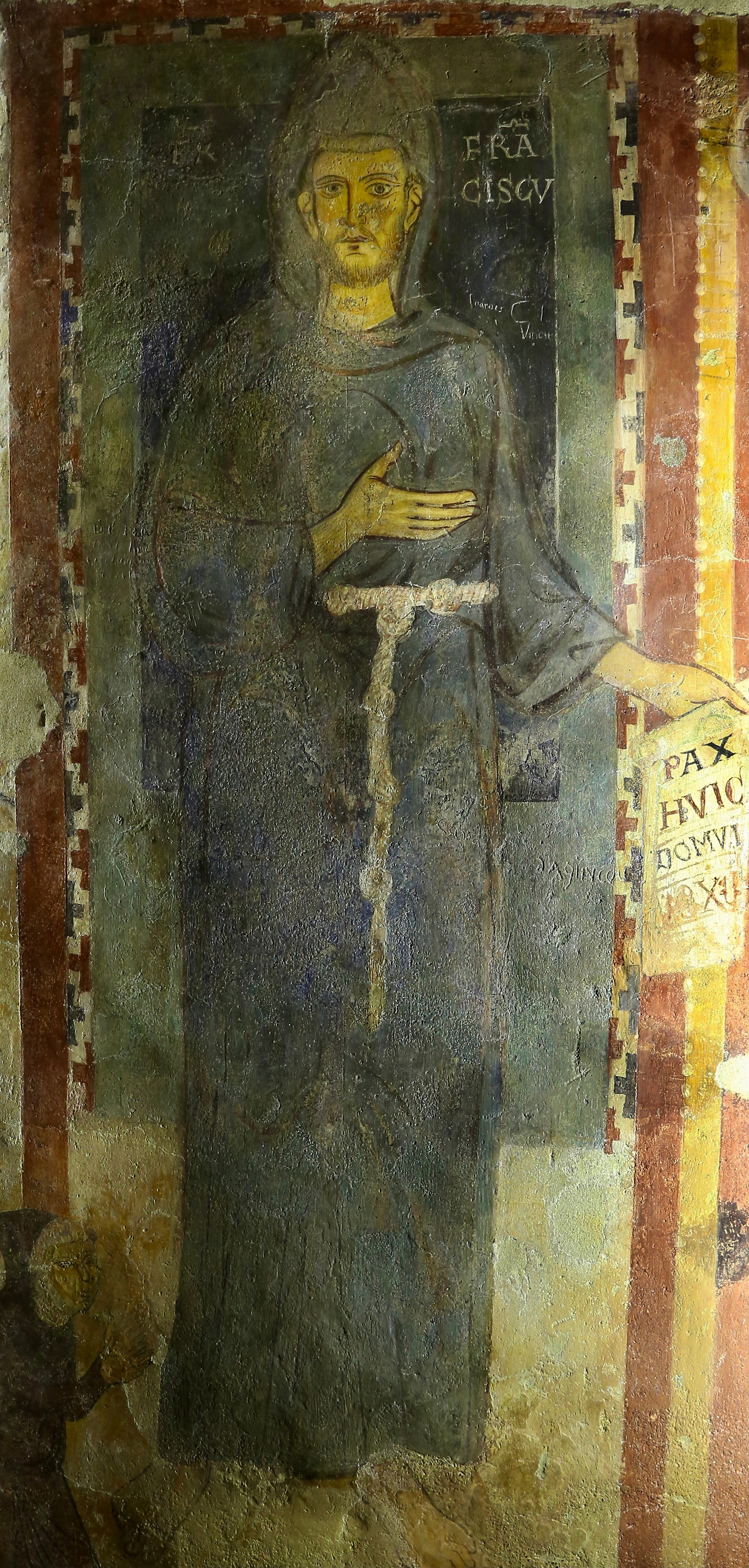 이 계단을 올라가면 성 그레고리오 소성당이 나옵니다. 이곳에 있는 그림 역시 콘솔루스를 포함해서 로마 학파에서 그렸습니다. 소성당을 들어가면 오른쪽 편으로 바로 아시시의 성 프란치스코의 초상화 (그림 21)를 볼 수 있습니다. 그런데 후광도 없고 손등에는 그리스도를 닮은 못 자국도 없습니다. 이것은 바로 성인께서 살아계셨을 때 그려진 그림이란 걸 뜻하고 있습니다. 프란치스코는 이곳에 세 번을 순례자로 왔다고 합니다. 이 그림은 프란치스코가 선종하시기 3년 전, 오상을 받기 1년 전인 1223년도에 그려진 모습입니다.