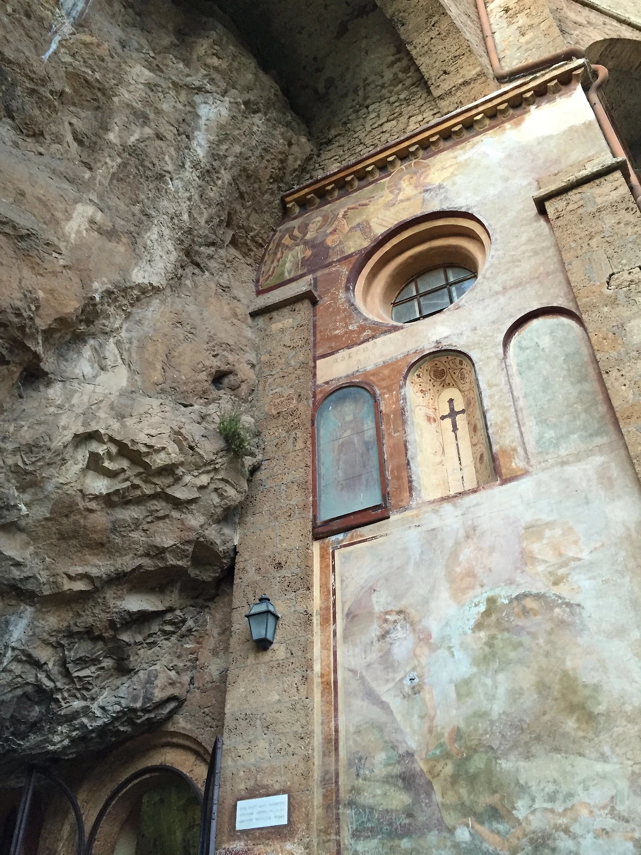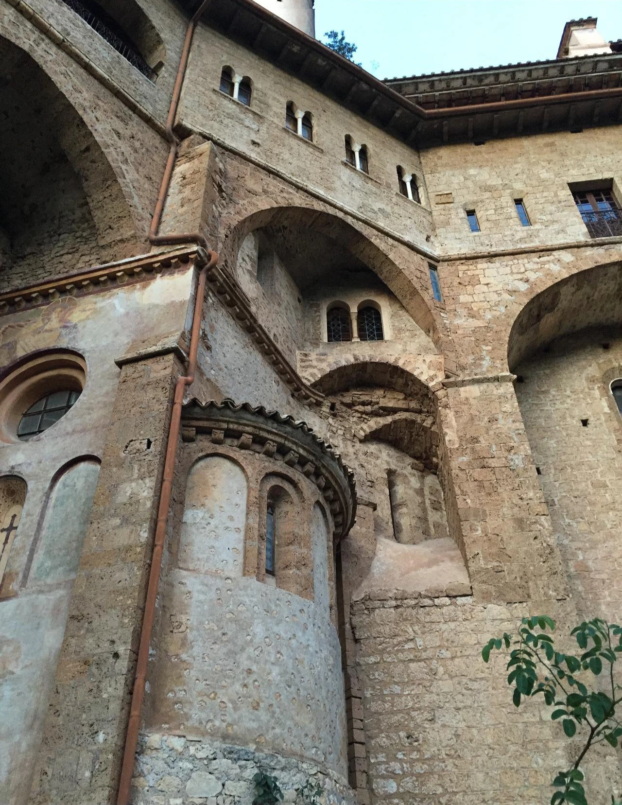 아래쪽 문밖으로 나가면, 바닥에 라틴어로 적혀있는 뚜껑을 볼 수 있는데, 그 아래 이곳에서 살았던 수도자들의 유해가 모셔져 있습니다. 수도자들은 죽어서도 수도원 밖을 나가지 않았다고 합니다. 장미 나무들이 심어져 있는 이곳은 베네딕도의 장미 정원이라고 부르고 있고, 가시나무에 몸을 던지며 적극적으로 유혹을 떨쳐 이겼던 두 성인, 베네딕도와 프란치스코를 기억시켜 주는 곳입니다. 이곳에서 수도원 건물을 쳐다보면 절벽과 붙여 만들어진 건물의 모습을 다시 확인할 수 있고 수 세기 동안 다른 양식으로 겹겹이 쌓여 만들어진 모습에 신비롭기까지 합니다.