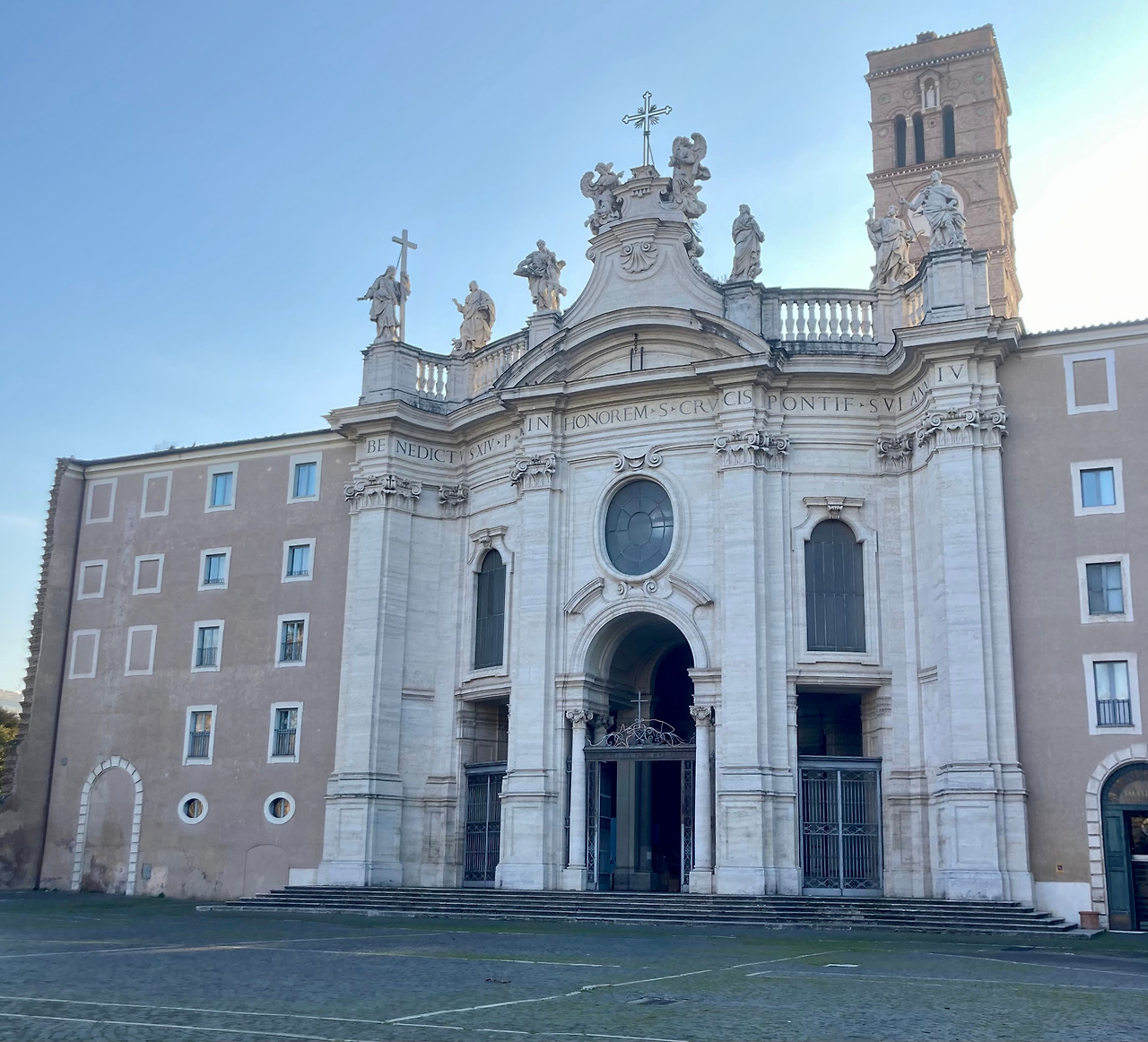 여러 교황에 의해 보수되고 증축되던 성녀 헬레나의 소성당은 1144년 루쵸 2세 (1144-1145) 교황 때 로마네스크 양식으로 된 3랑 식 성당을 가지게 됩니다. 그리고 현재 보이는 종탑도 이때 만들어졌습니다. 현재의 성당 정면과 현관이 덧붙여진 것은 베네딕도 14세 (1740-1758) 교황 때이고 건축가 피에트로 파싸라콰 (Pietro Passalacqua)와 도메니코 그레고리니 (Domenico Gregorini)에 의해 후기 바로크 양식으로 1740년에서 1758년도에 만들어졌습니다. 단층으로 된 정면은 세 개의 문과 세 개의 창문을 가지고 있고 베네딕도 14세 교황 재위 4년도에 거룩한 십자가를 공경하여 만들었다는 글자가 초석처럼 쓰여 있습니다.