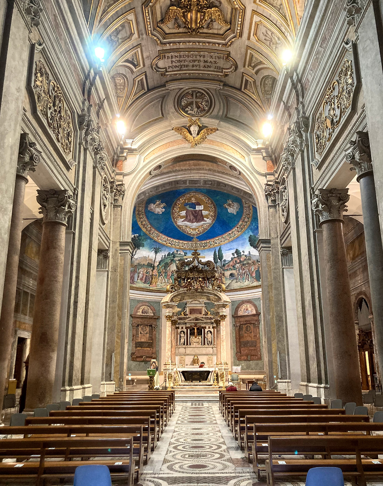 중앙 제대 밑에는 고대 로마 욕조로 쓰인 석관이 있고 이 안에 순교자 체사레오와 아나스타시오의 유해가 모셔져 있습니다. 1148년 로마의 유적지에서 가지고 온 네 개의 기둥 위에 1743년도에 도금한 청동으로 만들어진 치보리움이 순교자의 제대 위를 왕관처럼 덮고 있습니다. 그리고 그 위 반원형 천장인 압시대의 가장 중앙에 예수님께서 왼손에는 요한복음 14장 6절에 나오는 '나는 길이요 진리요 생명이다'의 라틴말 성서를 펴 보이고 있고, 오른손으로는 손가락 세 개를 펴고 두 개를 접음으로써 삼위일체의 하느님이시고 신성과 인성을 가지고 계신 예수님의 아이덴티티를 보여주시면서 당신을 바라보는 모든 사람들을 축복하고 계십니다. 그리고 예수님 주위에는 여섯 개의 날개를 가지고 있는 수많은 케루빔과 세라핌 천사가 예수님을 에워싸며 거룩하시다를 외치고 있는 듯 합니다.