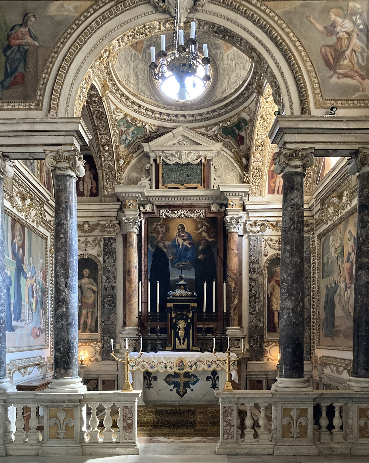 성 닐로와 성 바르톨로메오 사이에 있는 아기 예수님을 안고 있는 성모 마리아 제단화는 안니발레 까라치 (Annibale Carracci)의 작품입니다. 벽화의 내용들은 성 닐로와 성 바르톨로메오의 삶의 일부를 이야기하고 있습니다. 제대 옆 성직자석 (presbiterio)에는 도메니키노의 작품이 그려져 있는데, 오른쪽 벽은 동정녀께서 두 성인에게 나타나시어 자신의 이름으로 된 수도원을 세울 것을 말씀하시며 황금색 볼 (pomo d’oro)를 주고 있고 이것은 성모님의 지속적인 사랑을 뜻하고 있습니다. 왼쪽 벽은 성 닐로의 생애 (Bios)에 나오는 이야기 중에 하나로, 칼라브리아의 비잔틴 군대의 대장 폴리에우토 (Polieuto)의 마귀 들린 남자 아들을 성 닐로가 치유를 해주는 장면이며, 라파엘로의 마지막 그림인 ‘타볼산의 변모’에서 악령 들린 남자아이를 치유하는 드라마틱한 장면을 연상시켜주고 있습니다.