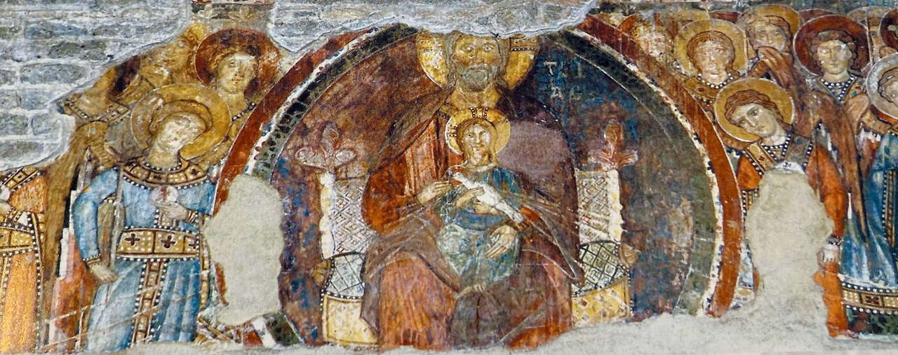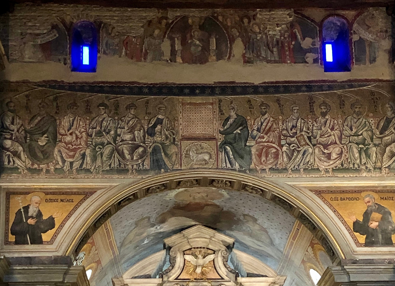이 모자이크 위에는 12~13세기 그려져 훼손은 되었지만 비잔틴 양식으로 된 삼위일체에 관한 프레스코화를 볼 수 있습니다. 성부 성자 성령은 한 옥좌에 앉아 있지만 성부는 가장 큰 모습으로 자신의 가슴 쪽에 성자를 감싸 앉고 있고 성자는 아기의 모습처럼 작지만 어른의 얼굴을 가지고 있으며 손에 성령인 비둘기를 잡고 가슴에 품고 있습니다. 성령의 비둘기에서는 열두 개의 빛이 뻗쳐 나와 바로 아래에 있는 모자이크 속의 열두 사도의 머리에 있는 빛과 연결돼 보이고 있어, 그림과 모자이크가 하나의 내용으로 완성된 이야기를 하고 있다는 것을 알 수 있습니다. 승리의 아치 양옆에는 성 닐로와 성 바르톨로메오의 모습도 그려져 있습니다. 이렇게 승리의 아치 위에 그려진 프레스코화와 모자이크는 삼위일체의 하느님으로부터 성령을 받는 사도들 그리고 수도원 창립자의 모습을 단계적으로 그려 넣음으로써 정통 교리를 따르고 있다는 정교회적 특징을 한눈에 잘 설명하고 있습니다.