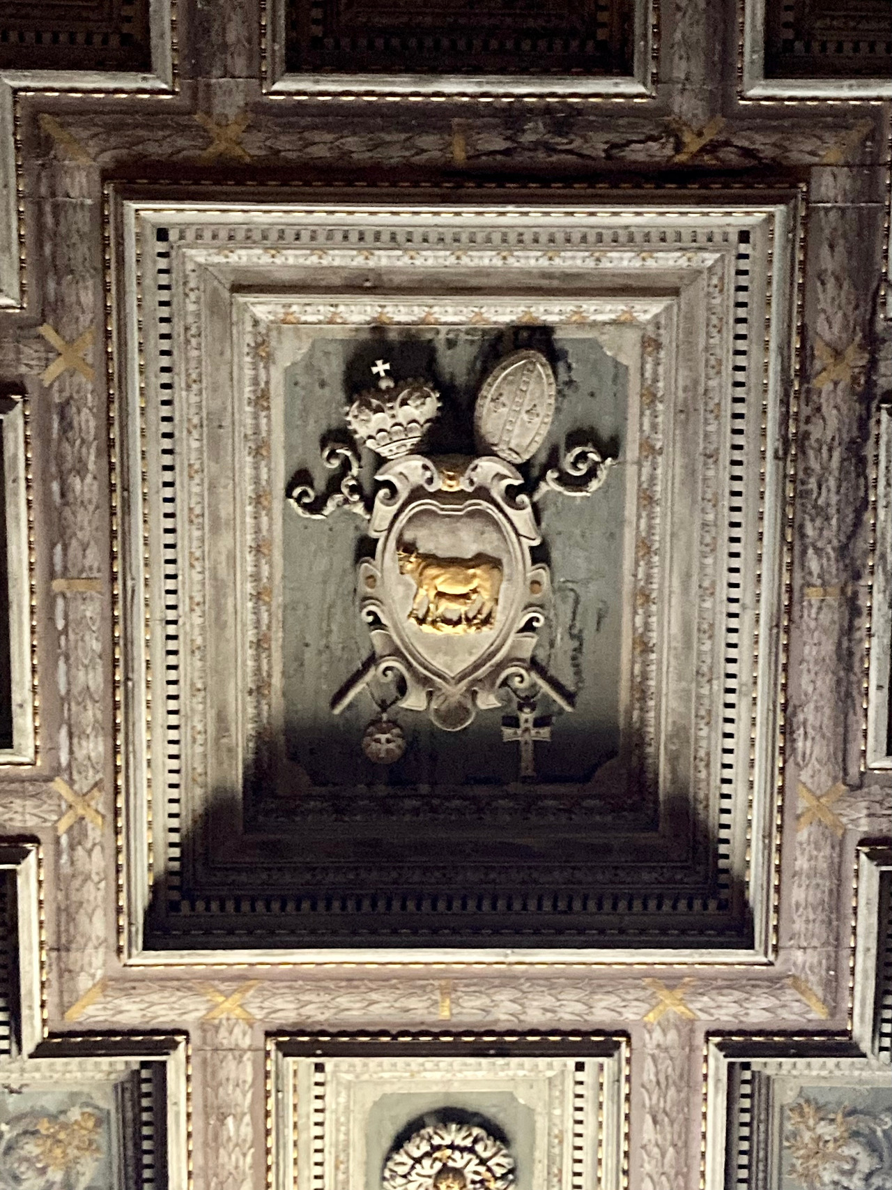 가운데 어미소의 젖을 물고 있는 송아지의 모습은 이곳의 수도자들이 예수님 대하는 것처럼 찾아오는 사람들을 극진하게 맞이한다는 뜻이고 그 위에 있는 정교회 주교의 모자와 지팡이 그리고 로마교회 주교의 모자와 지팡이는 두 교회 안에 동시에 속해있다는 것을 의미하고 있습니다.