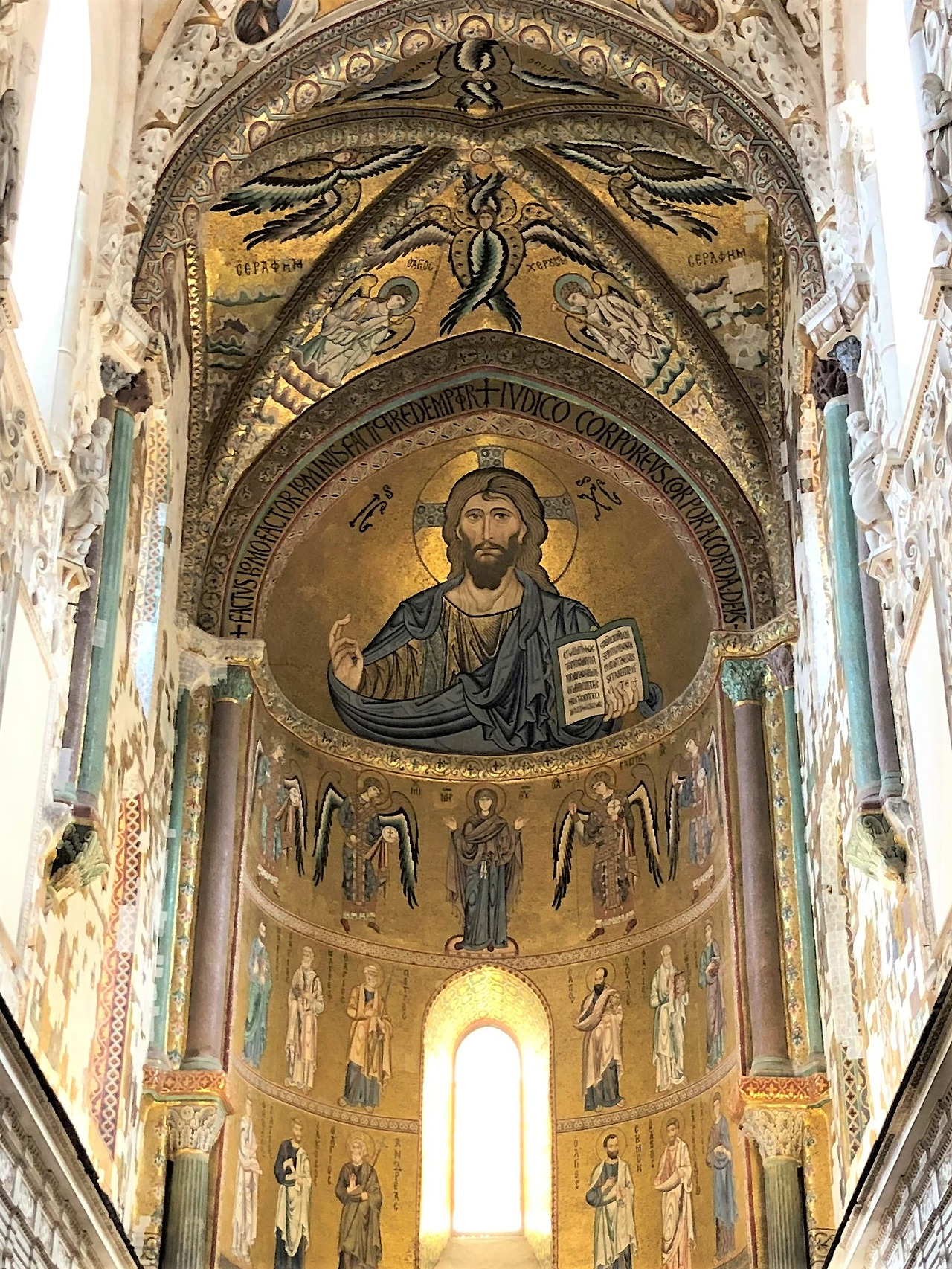 옥좌를 중심으로 양옆 첫 번째는 베드로와 그의 동생 안드래아가 있는데 이는 로마의 첫 주교로서 베드로, 콘스탄티노플의 첫 주교로서 안드래아를 뜻하면서 서방과 동방 교회가 독립적이면서도 예수님을 중심으로 하나 된 교회임을 설명해 주고 있습니다. 이 모자이크의 사도들 모습은 사용하는 돌의 색조를 잘 이용하여 깊이를 드러나게 하는 음영과 볼륨을 살리는 기술을 사용하고 있는데, 이것은 시칠리아에 있는 몬레알레 대성당과 체팔루의 대성당 모자이크 양식과 동일한 것입니다. 이것으로 이 성당을 건축할 당시 이탈리아 남부에 있던 모자이크 기술자들을 불러 만든 작품임을 충분히 짐작해 볼 수 있습니다.