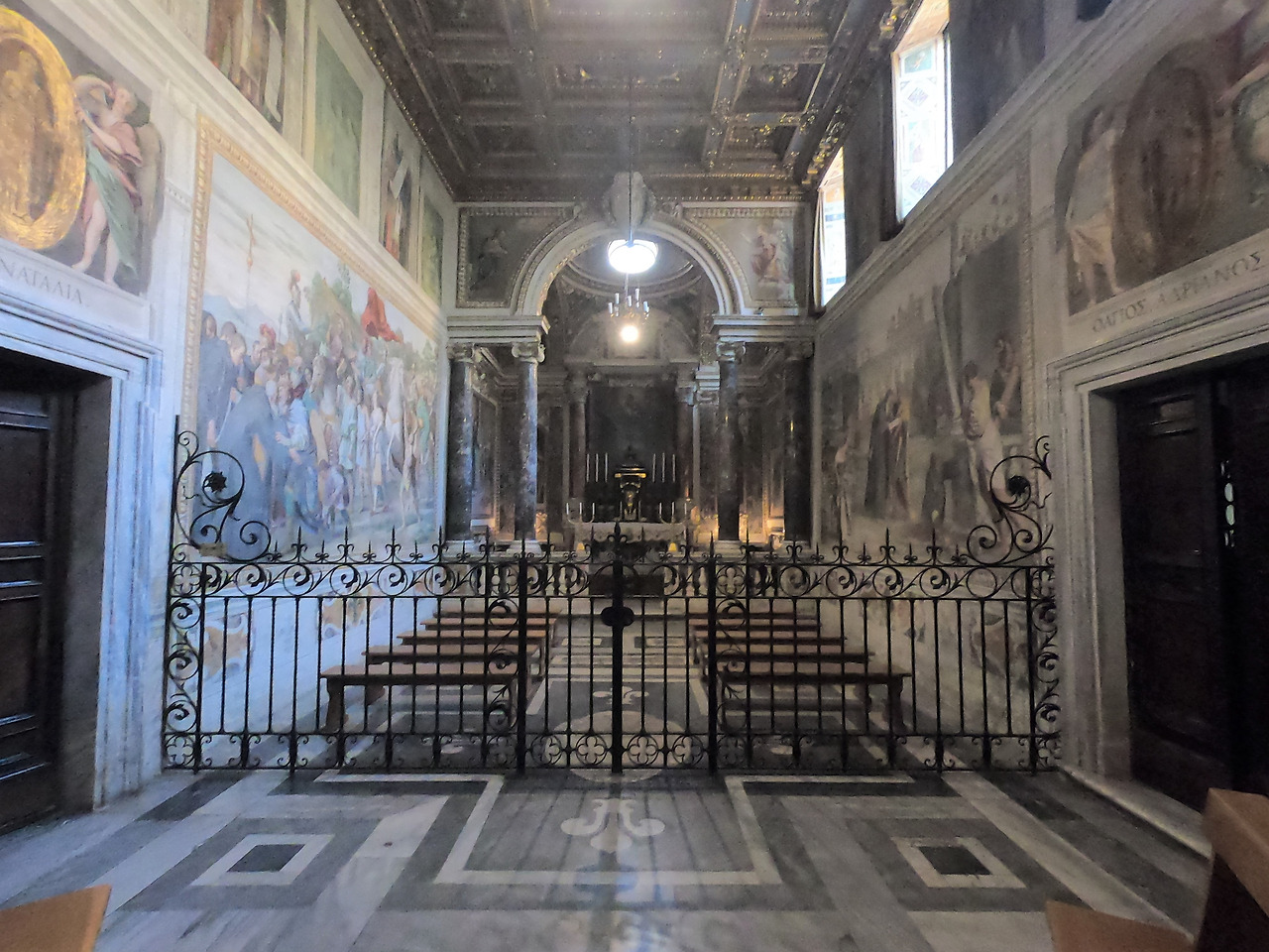 입구 쪽에는 십자가의 기적이라는 그림에서 성 닐로가 십자가 앞에서 유혹에서 해방될 수 있도록 기도하고 있고 십자가에 계신 예수님께서는 못 박힌 오른손을 십자가에서 떼어 축복하고 계십니다.