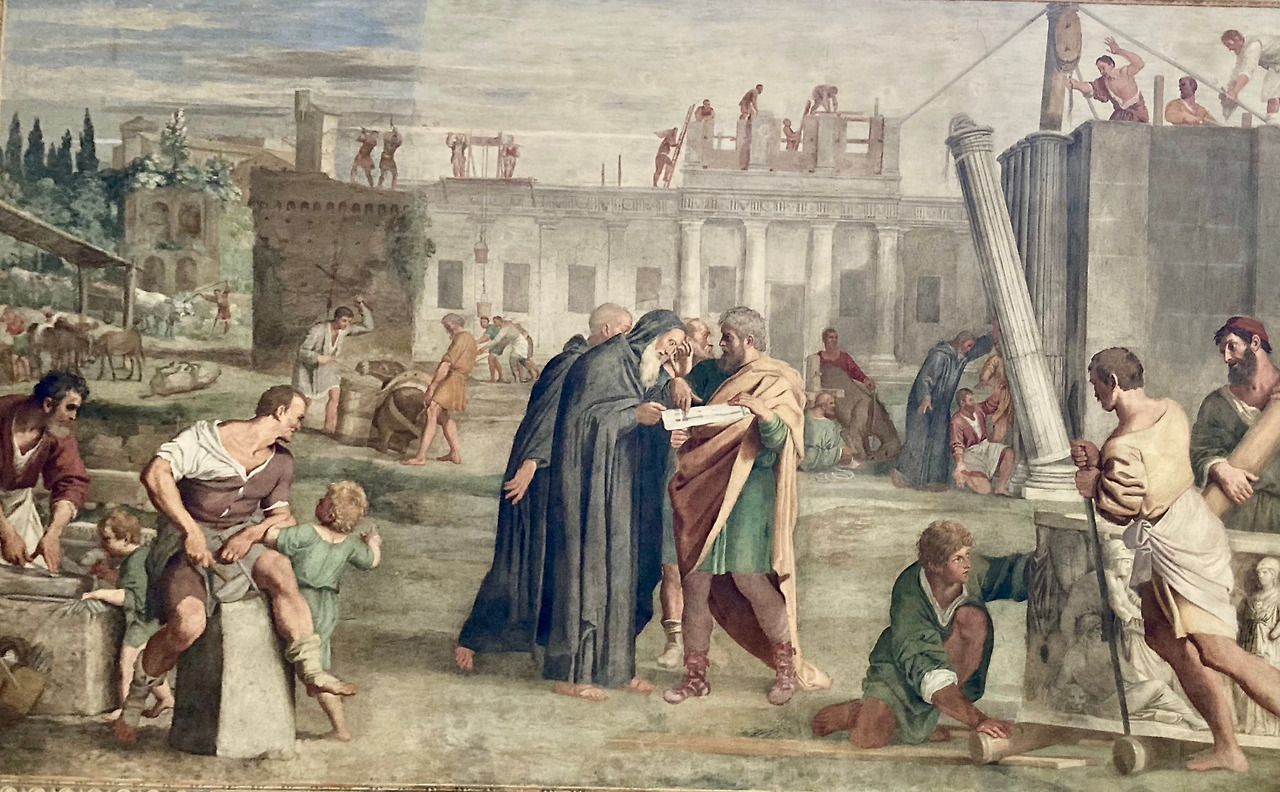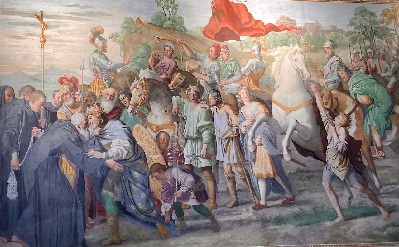 왼쪽 벽에는 1000년이 되던 해에 오토 3세 황제가 가르가노에 있는 성 미카엘 대천사 성지순례를 마치고 돌아오는 길에 몬테까시노 근처 세르페리 (Serperi)에서 닐로 성인을 방문하는 장면입니다. 황제는 성인에게 많은 땅과 재물을 드리고 싶었지만 성인은 이를 거절하면서 황제의 가슴에 손을 얹고 황제 본인의 영혼 구원만을 바란다고 말씀하십니다. 성인은 이미 황제의 죽음이 임박했음을 알고 있었고 2년 후인 1002년에 황제는 로마 근교 팔레리아 (Faleria)에서 숨을 거둡니다. 그때 나이 22살이었습니다. 이 그림에도 전통에 따라 당시 살아있던 사람들의 얼굴을 그려 넣었는데 황제의 얼굴은 오도아르도 파르네제 추기경으로, 그 뒤 말을 잡고 있는 오른편 사람은 도메니키노의 자화상이고 말 왼편의 두 명의 남자는 자신의 동료였던 귀도 레니 (Guido Reni)와 구에르치노 (Guercino)입니다.