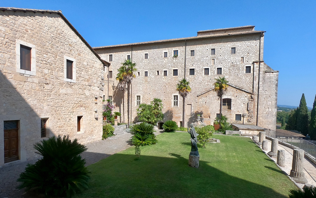 주차장에 도착하여 로마 집정관 이름으로 붙여진 마리오의 길을 건너면 하나의 웅장한 아치로 된 정문을 만나게 됩니다. 수도원은 성벽처럼 사면의 벽으로 둘러쳐 있는데, 이것은 요한 묵시록 21장 9절부터 나오는 새 예루살렘을 상징적으로 보여주는 것입니다. 정문 위 여덟 개의 창문을 가지고 있는 내부 공간은 15세기부터 시작된 교황이 파견한 대리 수도원장 추기경이 머물던 곳이었습니다. 대리 수도원장 추기경은 수도자가 아니었기 때문에 수도원 내부에서 함께 살지는 않았습니다.