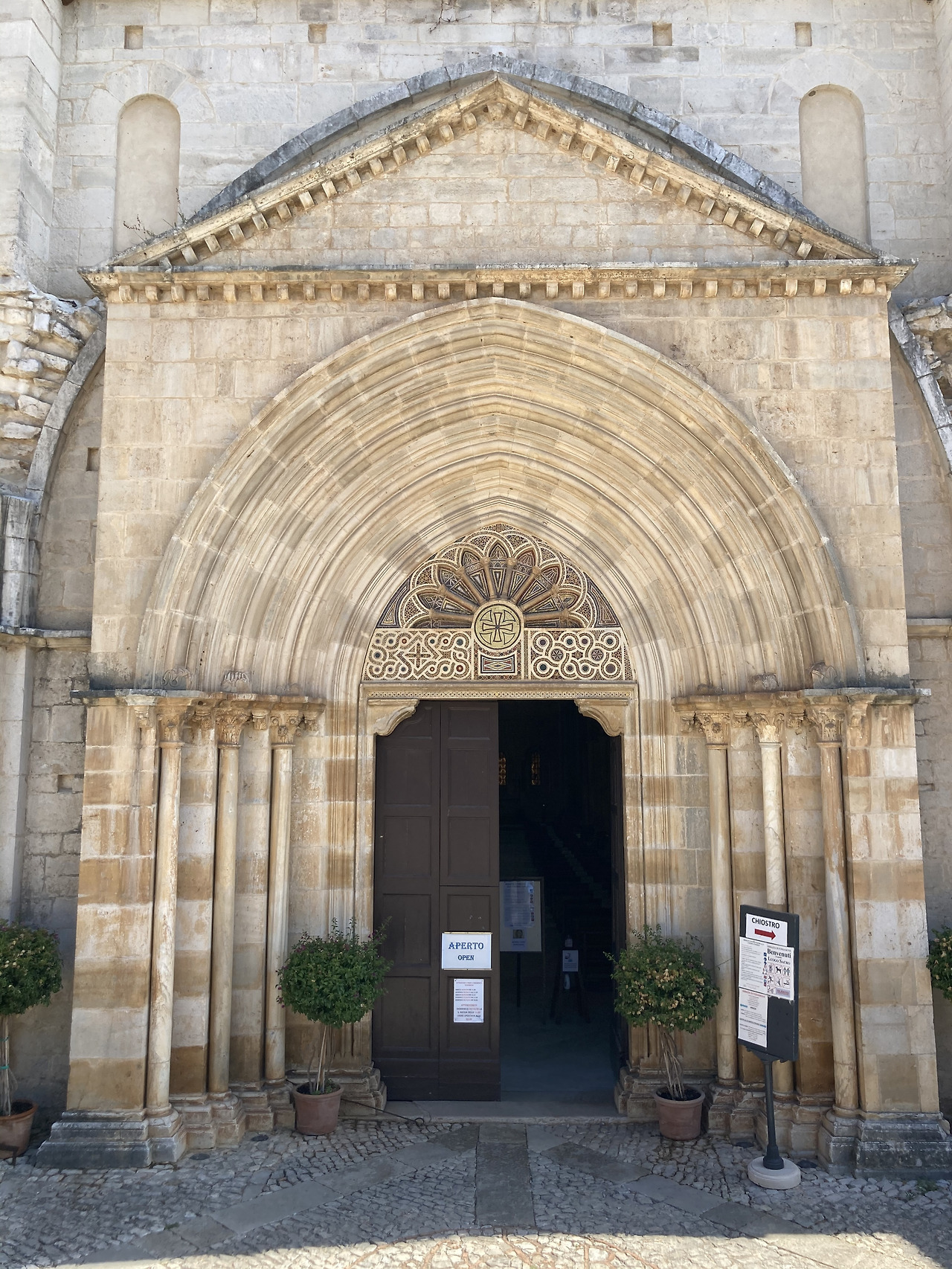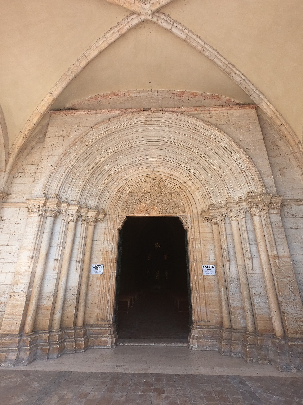 까자마리 수도원 성당과 포사노바 수도원 성당은 시토회의 전형적인 형식의 문을 동일하게 갖고 있지만 문 위에 들어가는 상징은 다르다고 할 수 있습니다. 까자마리의 포도 문양은 공동체의 중심이고 목자이신 예수 그리스도를 상징하고 있다면, 포사노바의 성당 문은 십자가를 문 중심에 보여줌으로써 그리스도와 함께 죽음을 통해 부활을 얻는다는 성지 기사단의 생각이 강하게 드러나고 있습니다. 특히 이 십자가는 우리가 많이 보는 라틴 십자가가 아니라 가로 세로 길이가 같은 예루살렘 십자가입니다. 이것은 포사노바 수도원이 성전 기사회와의 강한 연대감뿐만 아니라 그 정신도 함께하고 있다는 것을 보여주는 것이기도 합니다.