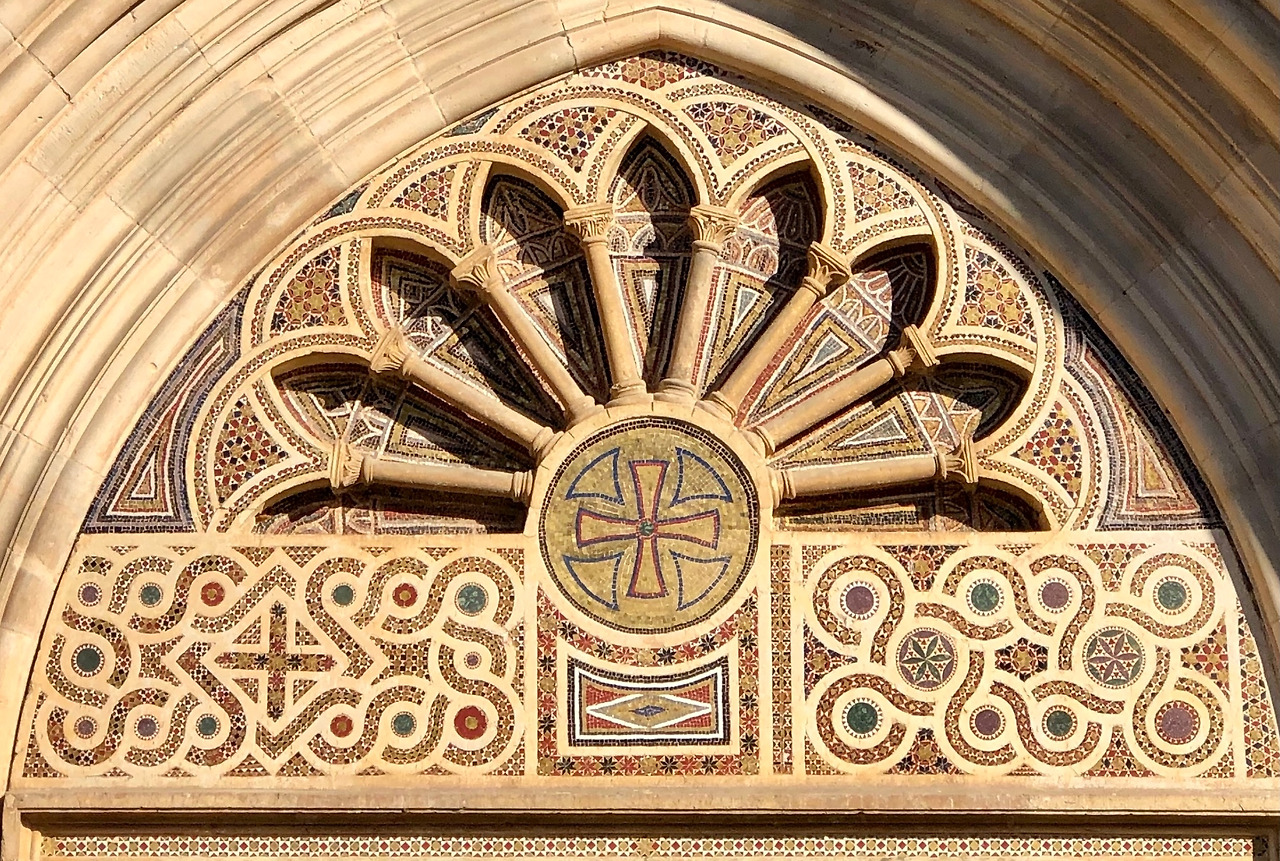모자이크로 장식이 된 중앙 부분에서 성전 기사회 십자가를 제일 먼저 볼 수 있습니다. 붉은색을 사용한 정 십자가의 형태이고 십자 끝의 꼭짓점은 두 개씩 모두 여덟 개를 가지고 있습니다. 그래서 성전기사회 십자가를 진복팔단 십자가라고 부르기도 합니다. 8이라는 숫자는 성전기사회의 십자가를 은유적으로 표현하는 수단이 되기도 합니다. 그래서 성전기사회의 십자가 모양이 아니더라도 숫자 8을 상징하는 것들을 곳곳에서 많이 볼 수 있습니다. 십자가 위 반달형 창문에도 여덟 개의 기둥이 있고, 기둥과 기둥을 잇는 반원도 여덟 개를 가지고 있습니다. 성당 정면 가장 위에 있는 눈의 창도 팔각형으로 만들어져 상상으로 만들 수 있는 성전 기사단의 십자가를 눈으로 그릴 수 있습니다.