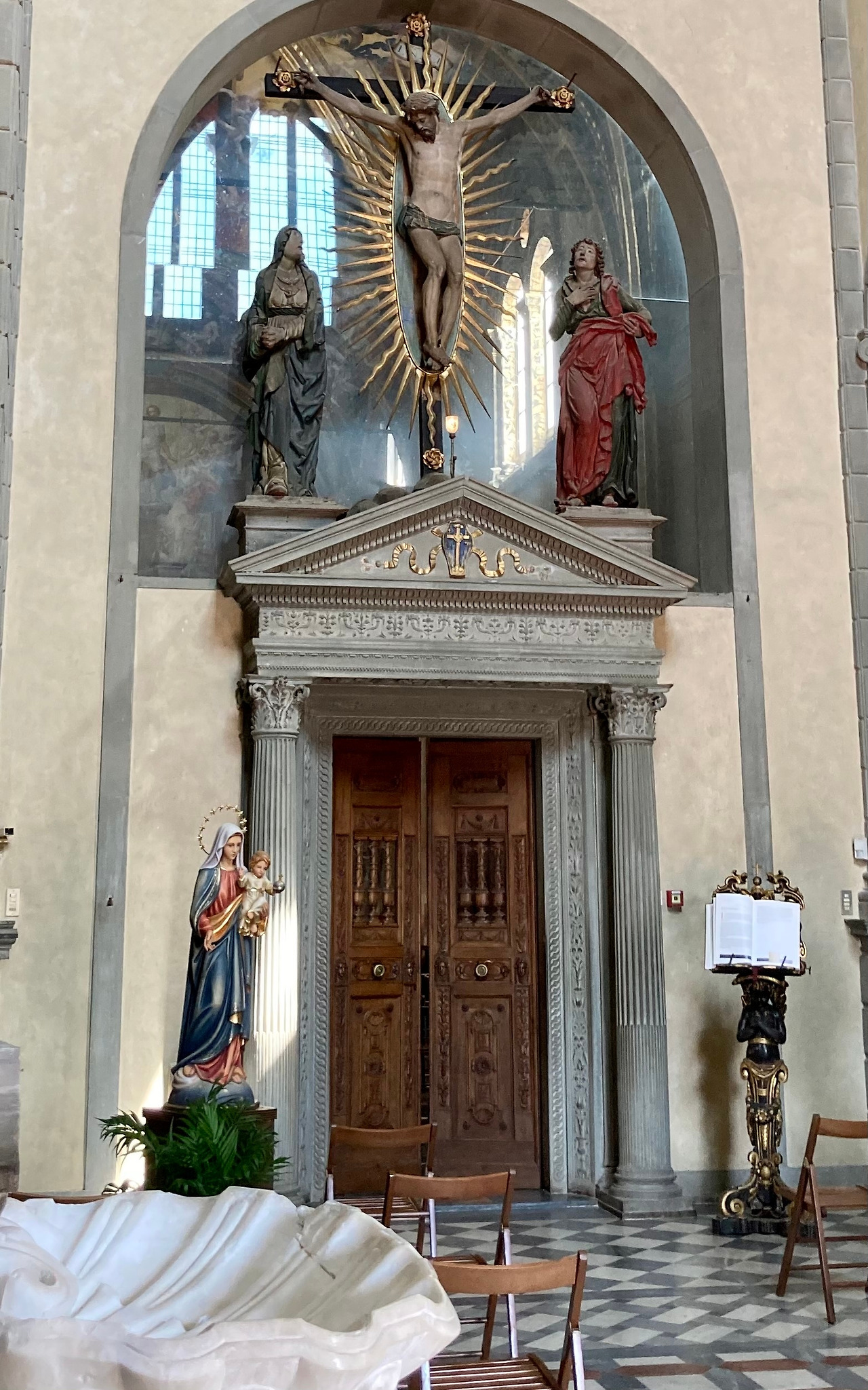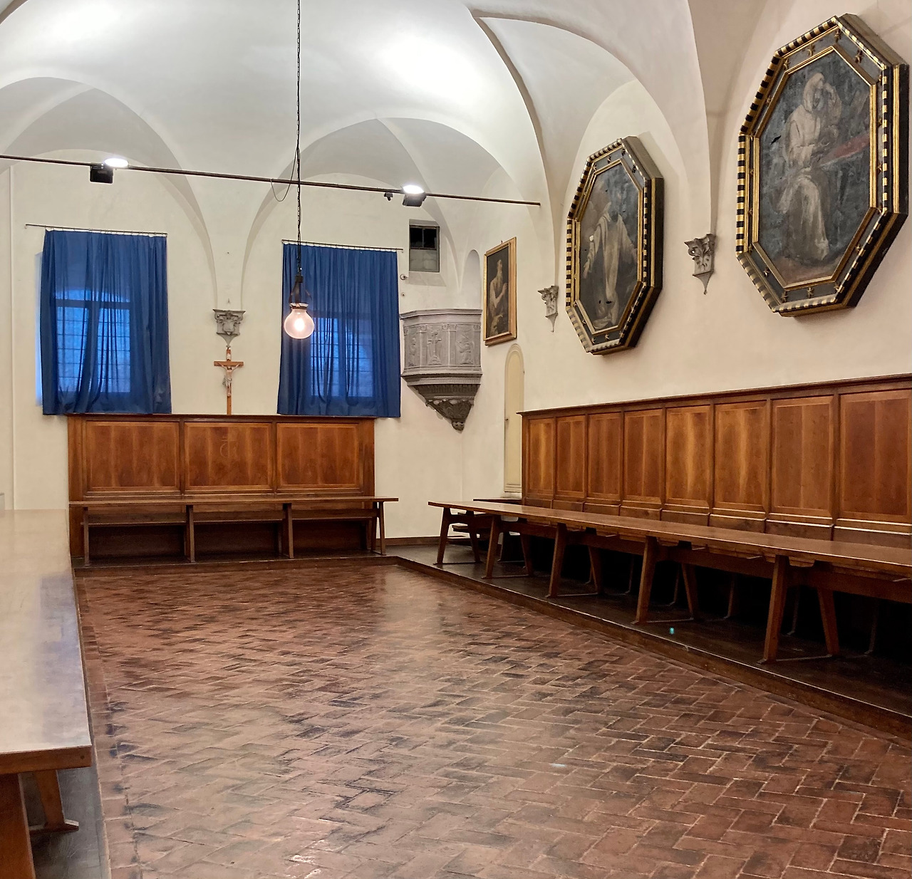 성당 안으로 들어서면 바로 평수도자들이 사용했던 공간이 나옵니다. 정면 성직 수도자와 평수도자의 공간을 분리하는 문 위에는 17세기 독일의 예술가가 만든 나무 십자고상과 성모 마리아 그리고 사도 요한 조각상이 있습니다. 그 밑으로 세레나의 돌(2) (pietra serena)로 정교하게 만든 또 다른 문을 볼 수 있는데, 이것을 통과하면 사제 수도자의 기도석과 제단이 나오게 됩니다. 같은 수도원에서 살았지만 평수도자는 사제 수도자들과 마주치거나 말을 할 수도 없었고 기도도 분리된 공간에서 하였습니다. 해서 시토 수도원의 성당 기도석은 기도 수도자와 콘베르시 수도자의 자리가 분리되어 있어도 성당 중앙에 열려있는 공간에서 함께 기도했다고 한다면, 카르투시오회의 평수도자는 소리는 들리지만 볼 수는 없는 완전히 분리된 공간에서 기도를 하였습니다.