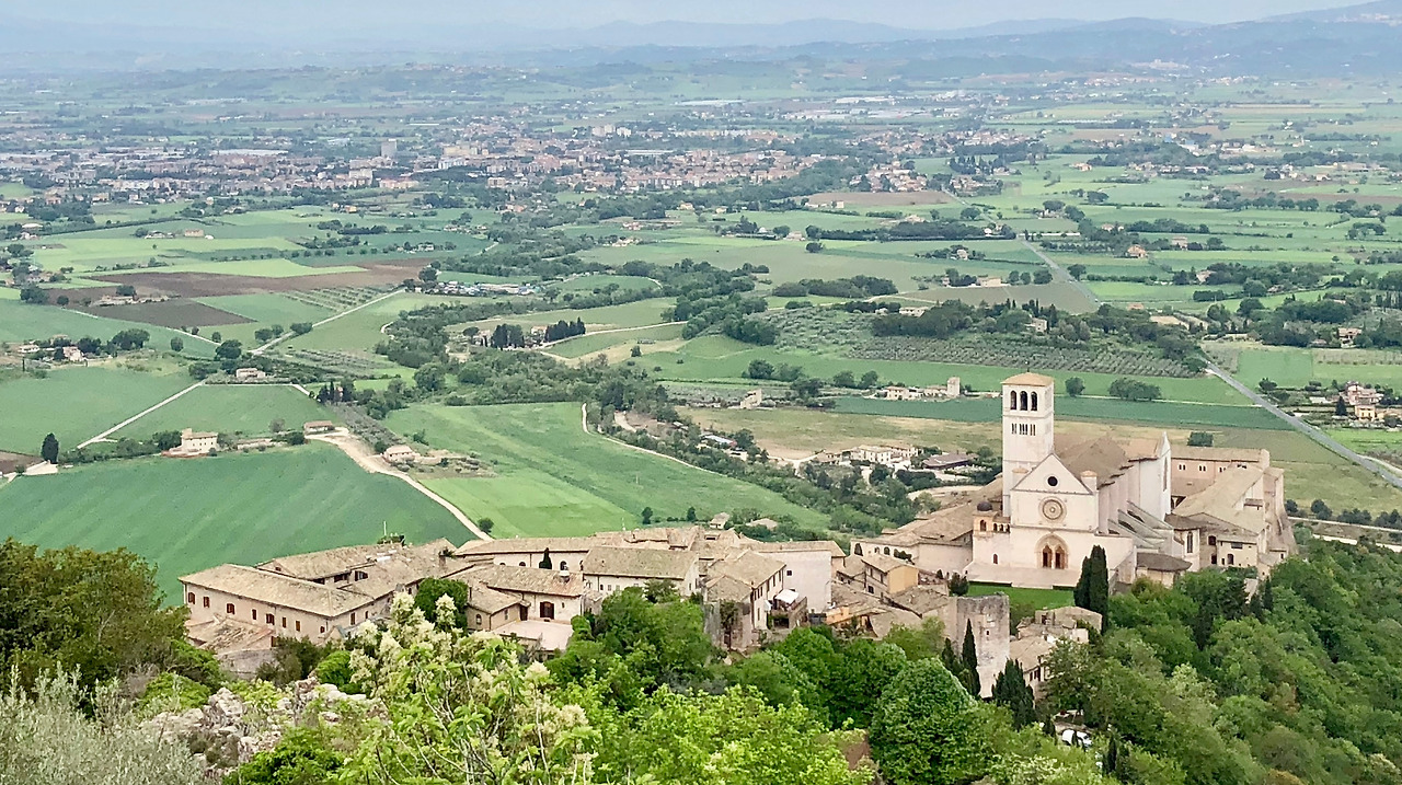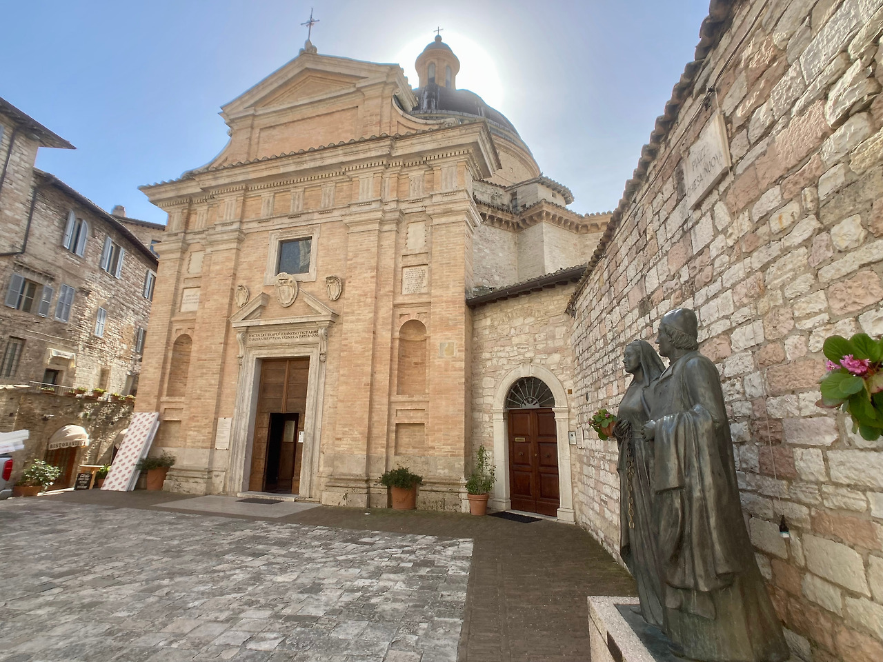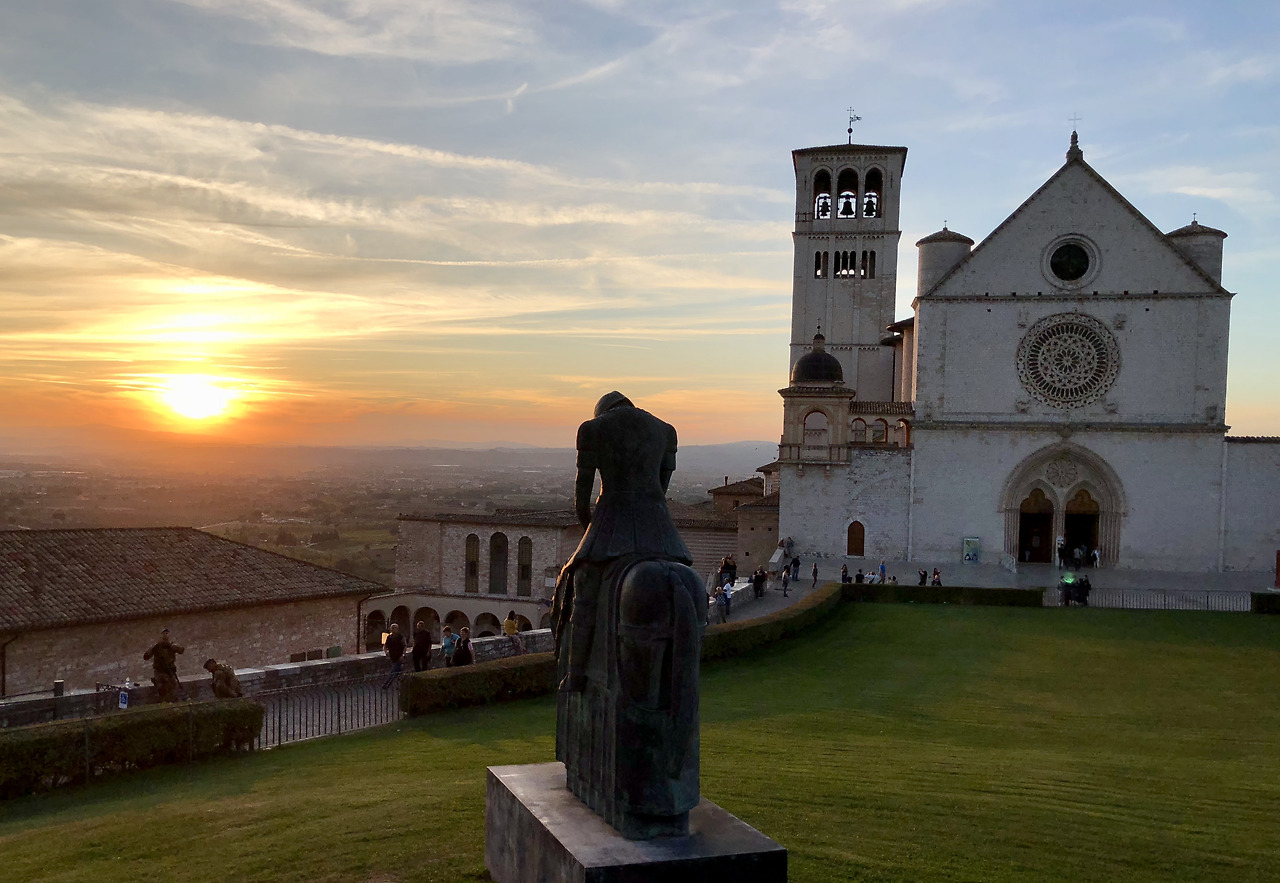 사진 설명 : 노을 지는 성 프란치스코 대성당 정면과 노르베르토 프로이에티 (Norberto Proietti, 1927-2009)가 만든 성 프란치스코 청동 기마상. 1202년 페루자와의 전쟁에 참여해 죽음과 패배의 비참한 바닥까지 떨어진 프란치스코의 모습을 통해 작가는 하느님 안에서 진정한 삶에 대한 답이 있음을 말하고 있다.