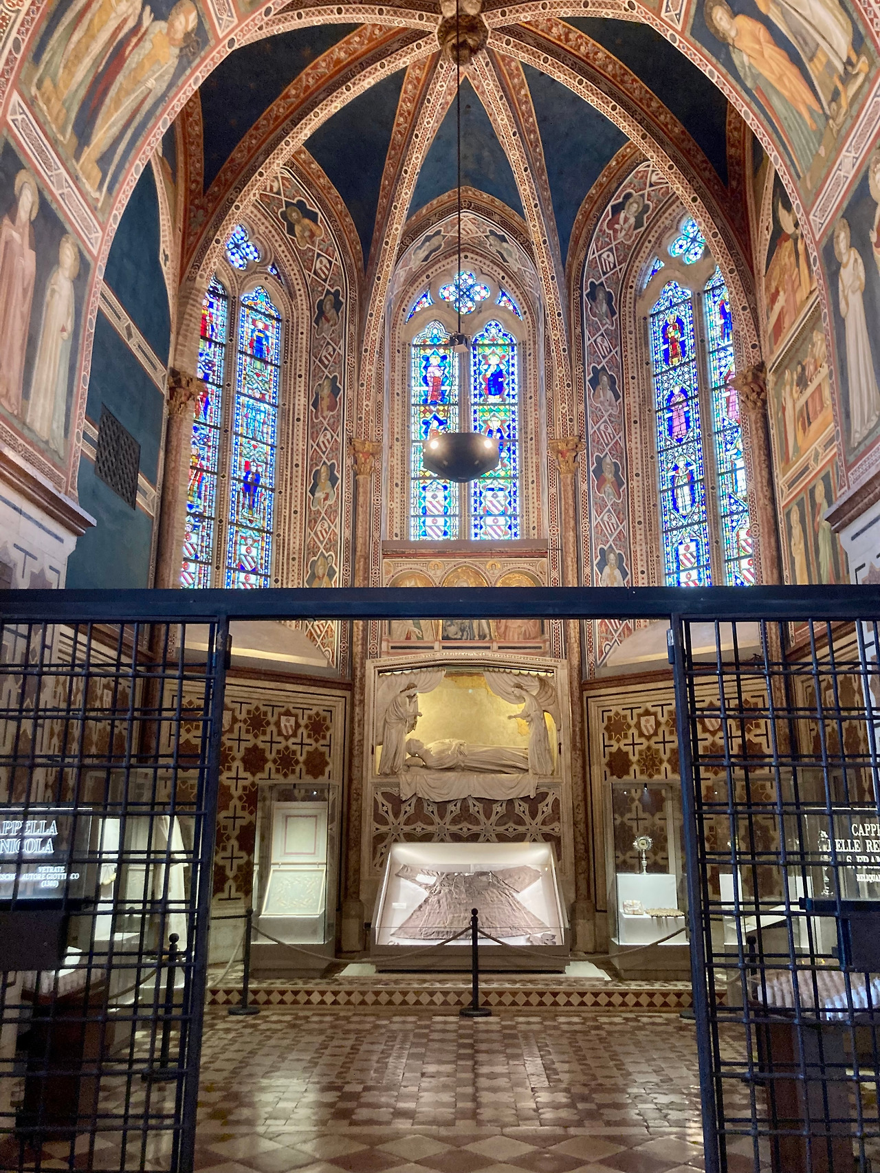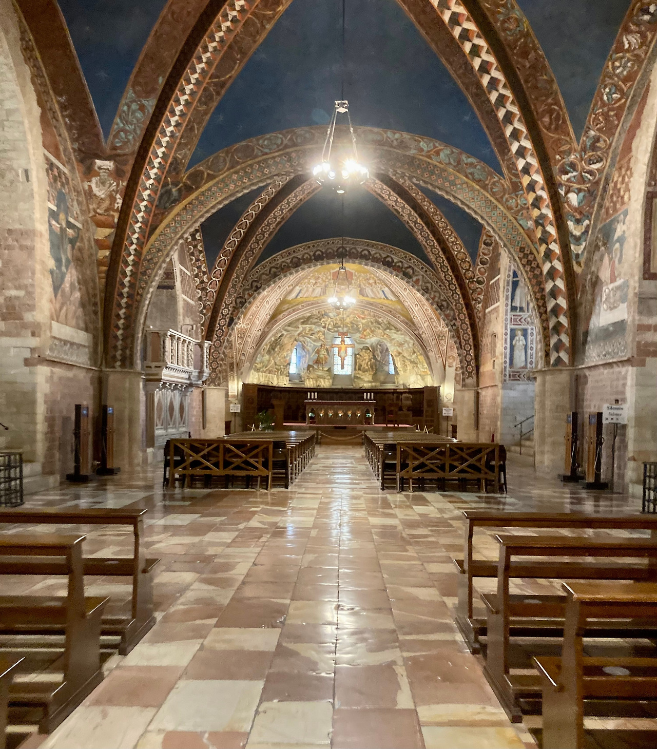 성당 내부는 불빛이 없어 옆에 소성당들도 만들어지지 않았다면 카타콤베나 무덤 속에 들어온 것처럼 무척이나 어두웠을 것입니다. 그리스도인들에게 어둠은 빛이 없다가 아니라 빛이 부족한 상태입니다. 그래서 그리스도인들에게 무덤은 죽음이 아니라 온전한 빛으로 가기 위한 쉼의 장소입니다. 지하 무덤 성당이 만들어지기 전 이곳은 프란치스코의 유해에 가장 가까이 갈 수 있었던 곳이었고, 성 프란치스코가 부활을 기다리며 쉬고 있는 장소였습니다. 우리는 이곳에서 위층 성당을 올라가기 전 부활을 준비하는 예행연습을 하게 됩니다.