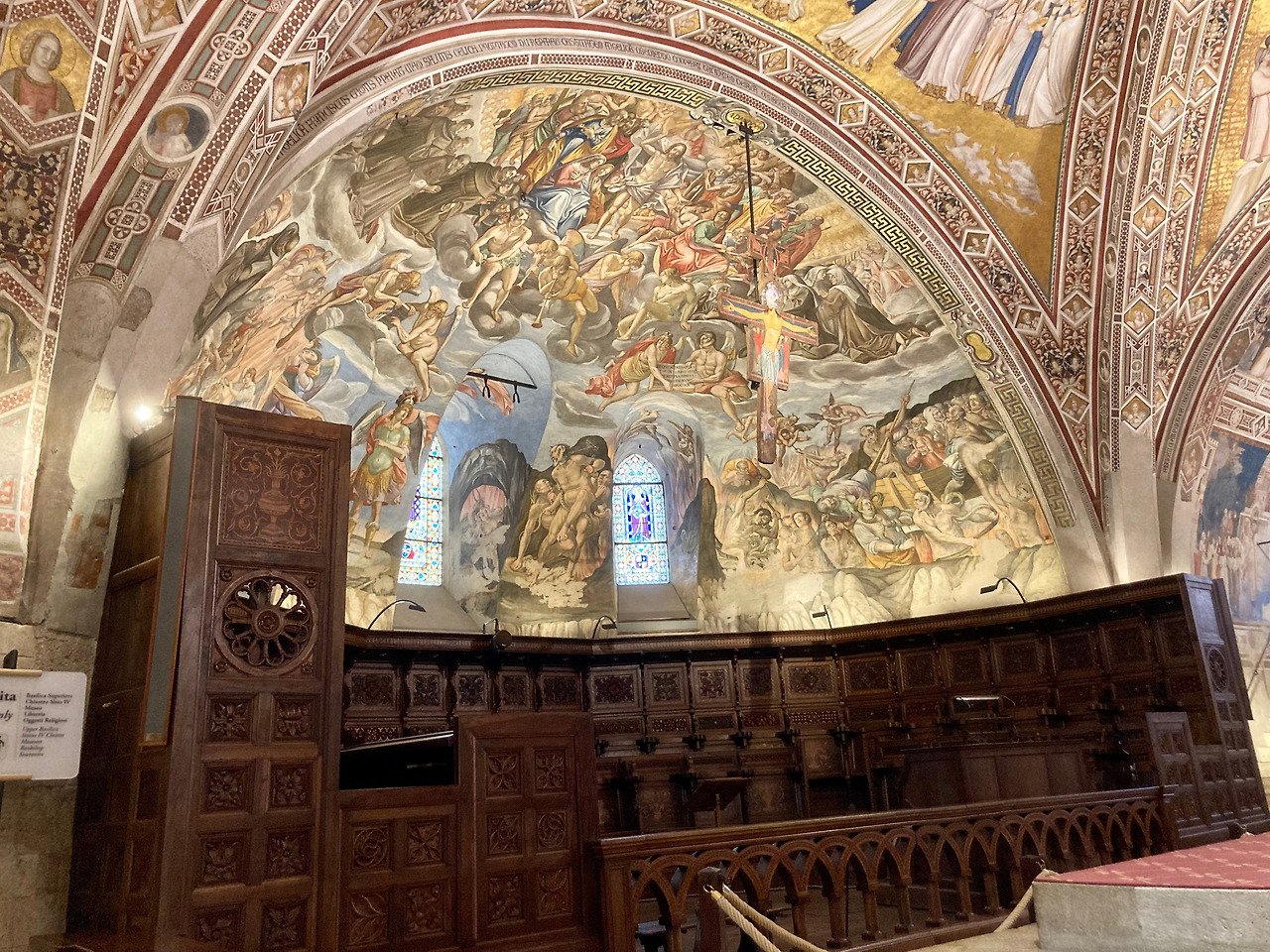 제대 뒤편으로는 1468년에서 1471년 사이에 리파트란소네의 아폴로니오 페트로키 (Apollonio Petrocchi)와 여러 장인들이 협력해서 만든 수도자들의 나무 기도석 (Coro ligneo)이 반타원형의 건축구조에 맞게 만들어져 있고 그 위 천장에는 체사레 세르메이 (Cesare Sermei) 1623년에 그린 최후의 심판 그림이 그려져 있습니다. 수백 년 동안 기도석에서 피운 양초의 연기에 훼손된 부분을 2009년 복원 작업을 거치며 예전의 색깔을 많이 찾게 되었습니다. 천상에서 최후의 심판을 내리시려는 예수님 주변에 프란치스코회와 글라라회 수도자들이 모습이 보이는 것이 특징적입니다.