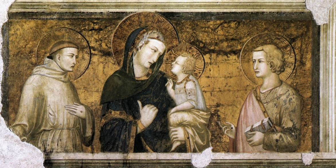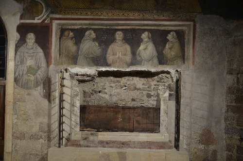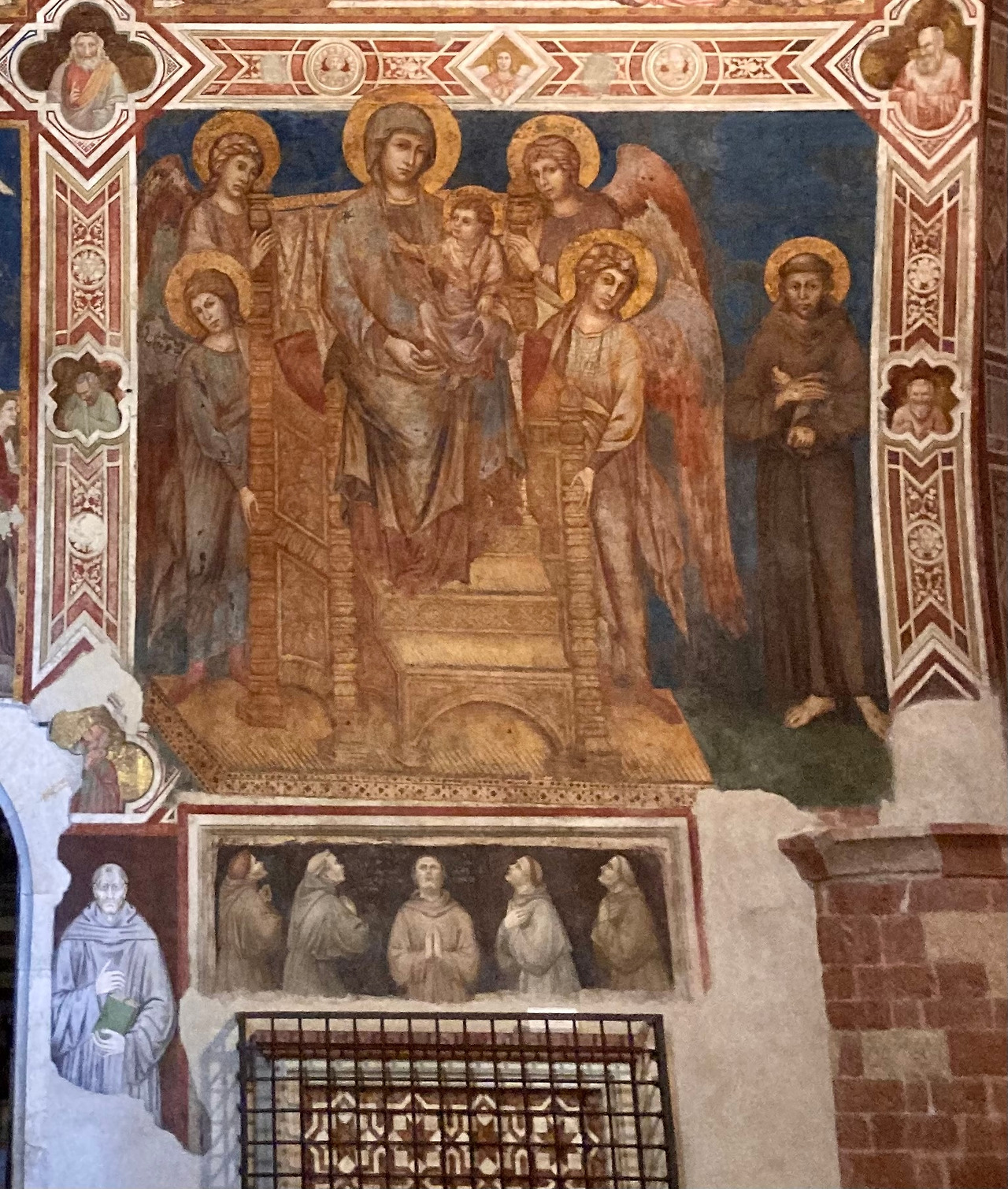 치마부에의 마에스타 아래에는 성 프란치스코와 함께 수도 생활을 시작한 초기 형제들 중 다섯 명이 마에스타를 바라보며 기도하는 모습이 그려져 있고 그 아래 벽 속에는 그들의 유해가 모셔져 있습니다.