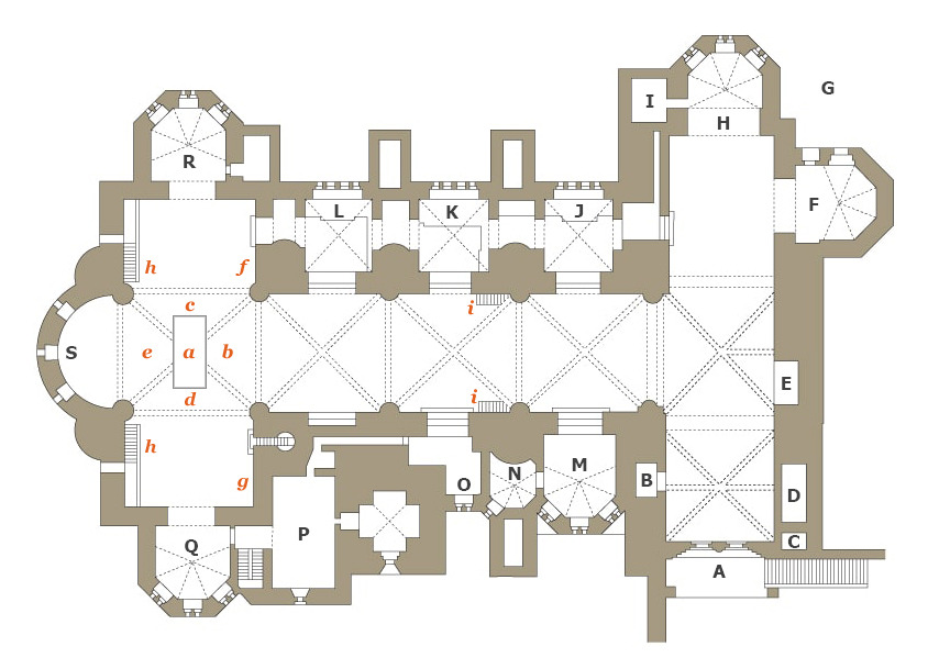 A 아래층 성당 정문 B 성 세바스티아노 경당 C 체르키 가문 무덤 D 성가대석 E 브리엔느의 요한 무덤 F 성 안토니오 아빠스 경당 G 공동 무덤 H 성녀 카타리나 경당 I 제의방 J 성 스테파노 경당 K 성 안토니오 경당 L 성녀 막달레나 경당 M 성 마르티노 경당 N 폰타나 경당 O 성 안드래아 경당 P 제의실 Q 마돈나 경당 R 성 니콜라오 경당 S 수도자 기도석과 후진 (최후의 심판 그림) a 중앙제대와 천장화 (b 청빈의 비유 c 정결의 비유 d 순명의 비유 e 프란치스코의 영광) f 치마부에의 마에스타 벽화 g 황혼의 성모 벽화 h 위층 성당으로 올라가는 계단 i 프란치스코 무덤 경당으로 내려가는 계단