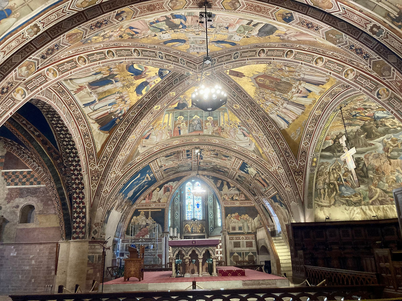 처음 아래층 성당이 만들어졌을 때는 좌우에 있는 소성당들이 없는 하나의 중앙 회랑만 가지고 있었습니다. 벽을 부수고 증축해서 소성당을 만들었다는 것을 벽에 있던 그림들이 손상된 것으로 충분히 짐작할 수 있습니다. 소성당들은 고위 성직자나 귀족들의 봉헌으로 만들어지게 되고 당대 최고의 화가들을 불러 소성당 내부의 프레스코화를 그리도록 하였습니다. 오른편 세 개의 소성당 그리고 왼편에 두 개의 소성당이 있는데 그중 유명한 것은 1313년에서 1318년 사이에 시모네 마르티니 (Simone Martini)가 그린 투르의 성 마르티노 소성당입니다.
