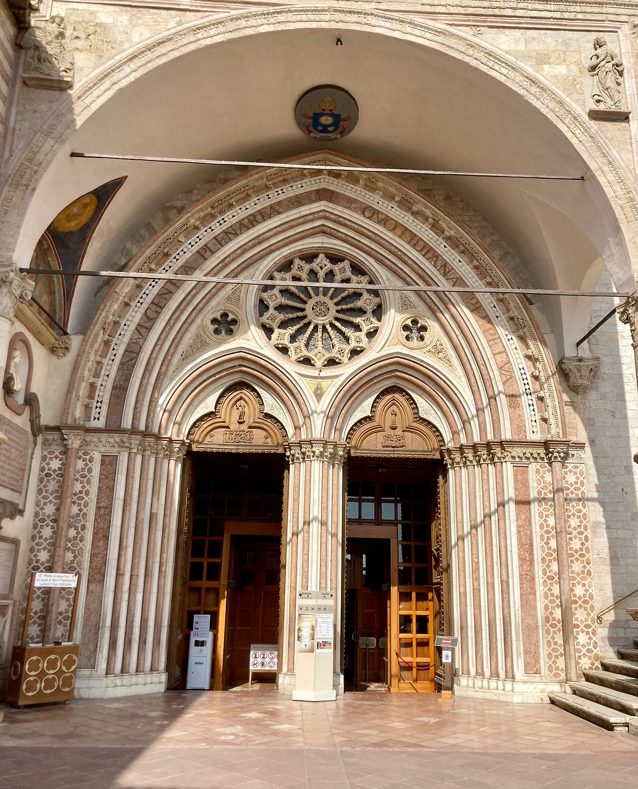 아래층 성당의 문은 사실상 정면이 아닌 앞쪽 측면에 만들어져 있습니다. 이유는 아래층 성당이 성인의 유해를 보호하고 외부인들로부터 도굴을 방지하려는 성 프란치스코의 무덤 역할을 했기 때문이기도 하고, 지형적으로 평지가 아닌 절벽으로 떨어지는 언덕에 성당을 세웠기 때문에 아래층 정면은 자연스럽게 땅속에 위치하게 됩니다. 하지만 1271년 전에 완성된 웅장하고 아름다운 고딕 양식의 문은 대성당 입구로도 전혀 손색이 없어 보입니다. 고딕 아치형을 가지고 있는 두 개의 문과 함께 이 두 개의 문을 둘러싸고 있는 또 따른 큰 아치는 비록 두 개의 문이지만 세 개의 문처럼 보이게 함으로써 삼위일체이신 하느님을 상징적으로 잘 나타내고 있습니다. 또한 고딕 양식의 성당 문 위에 들어가는 장미 원화 창도 빼놓지 않고 만듦으로써 아래층 성당도 위층 성당과 같은 독립된 장소임을 다른 한편으로 알려주고 있습니다. 그리고 그 옆에 작은 창 두 개를 추가함으로써 문처럼 상징적 3이라는 교회 숫자를 다시 드러내고 있습니다. 큰 창이 창과 두 문 사이에 역삼각형으로 된 부분에는 이 문을 들어오는 모든 사람들을 축복하는 성 프란치스코의 모자이크를 볼 수 있습니다.