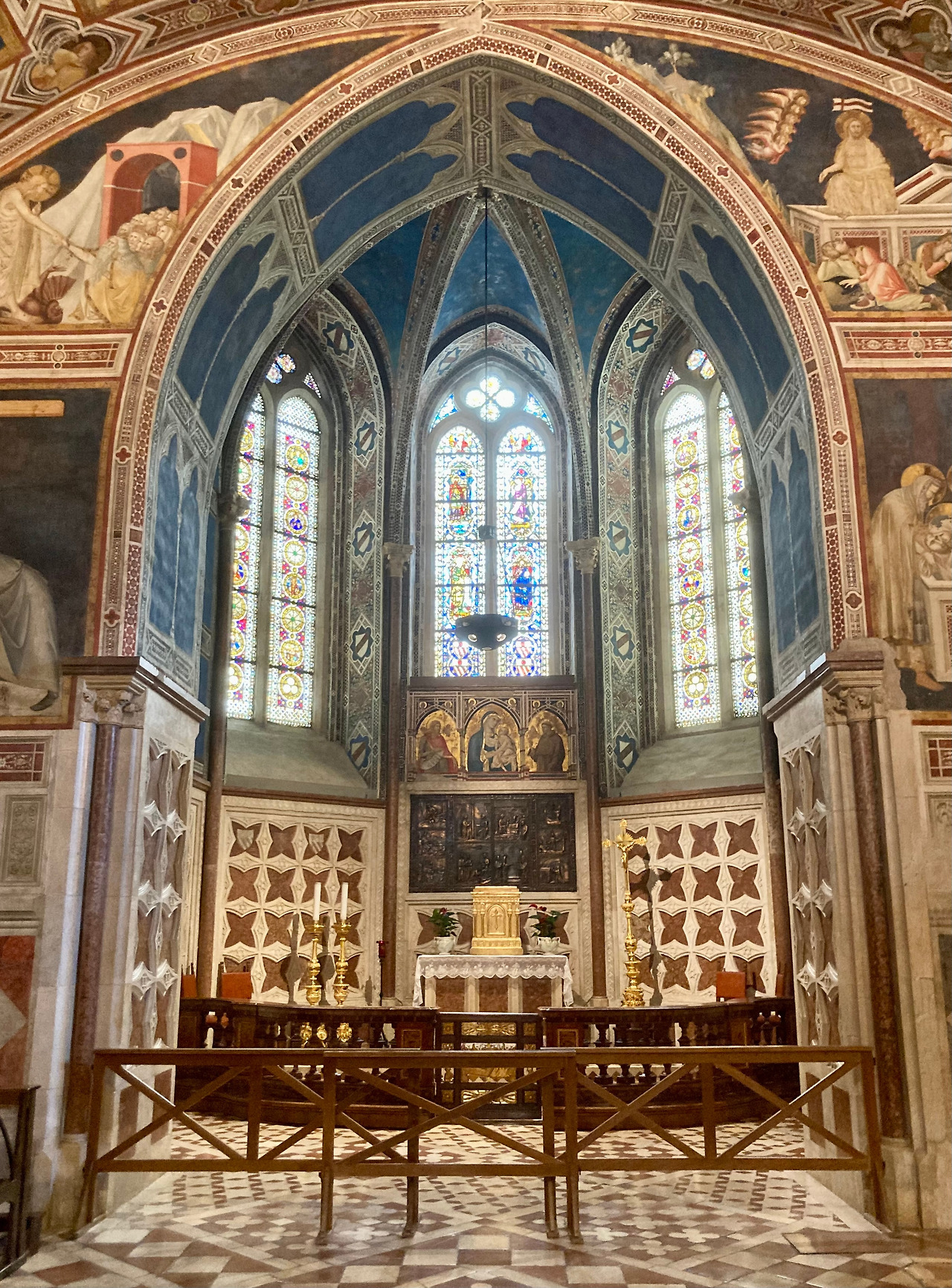 중앙 제대 오른편에는 조토의 스승 치마부에가 그린 마에스타 (Maesta')라는 그림이 있습니다. 마에스타는 스승이라는 의미로 성모가 아기 예수님과 함께 옥좌에 앉아있는 모습에 붙여진 이름이고, 13세기 중반부터 14세기 사이에 제단화나 프레스코화로 유행하던 양식이었습니다. 물론 이 그림과 반대되는 개념으로 땅바닥이나 방석 같은 곳에 아기 예수님을 안고 있는 마돈나 델 우밀타 (Madonna dell'Umilta', 겸손하신 마돈나)라는 그림들이 14세기부터 등장하기도 하였습니다. 그런 의미에서 만약 치마부에가 아닌 14세기에 다른 화가가 이곳에 같은 테마로 그림을 그렸다면, 가난하고 겸손한 교회를 상징하는 마돈나 델 우밀타가 그려졌을 것 같고 프란치스코 성당에 더 잘 어울렸을 것 같다는 생각을 개인적으로 해봅니다.