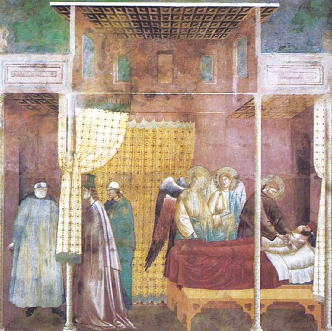 28편의 그림 중 지금부터 등장하는 마지막 세 편은 천상에 있는 성 프란치스코가 세상 사람들의 일에 관계하고 있다는 이야기입니다. 이 그림은 하나의 방을 보여주고 있습니다. 침대에는 온몸에 상처를 입고 붕대를 감고 있는 환자가 있고 그 옆에는 성 프란치스코와 두 천사가 있습니다. 왼편에는 환자의 가족과 함께 머리에 초록색 모자를 쓰고 있는 의사가 등을 돌려 집 밖으로 나가고 있습니다. 의사가 환자에게서 등을 돌리고 있다는 것은 이 세상에서 더 이상 치료할 방법이 없다는 것을 뜻하고 있습니다. 성 프란치스코 옆에 두 천사가 있다는 것은 성인께서 이 세상이 아닌 저세상에서 왔다는 것을 의미하며 이 세상에 있는 사람들이 성 프란치스코의 모습을 볼 수 없다는 것을 상징합니다.