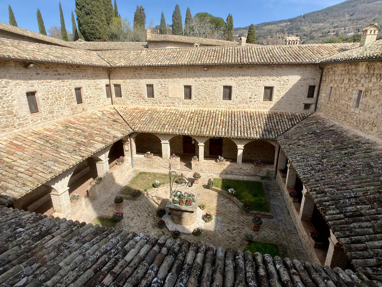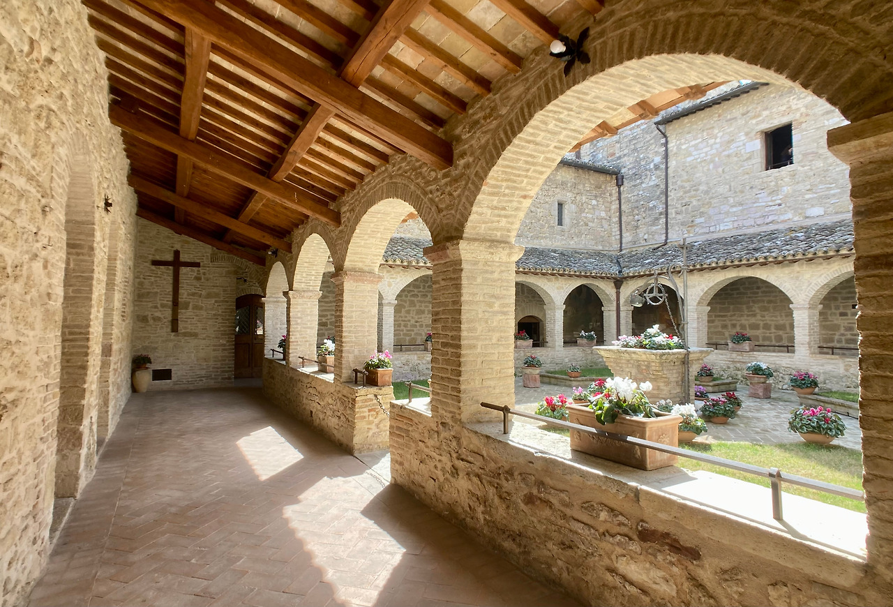 사진 설명 : 수도원 사각 정원. 회랑의 천장은 우물 쪽으로 기울어진 나무로 만들어져있고 벽돌 기와로 되어있다. 의미 부여를 하며 만들어진 시토회의 사각 정원과는 달리 프란치스코의 가난이 드러나는 단순함이 묻어나는 정원이다.