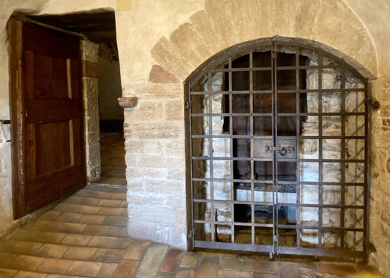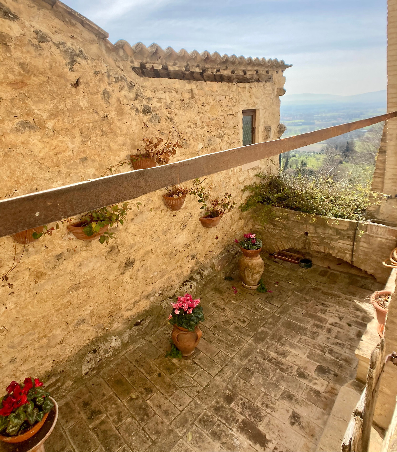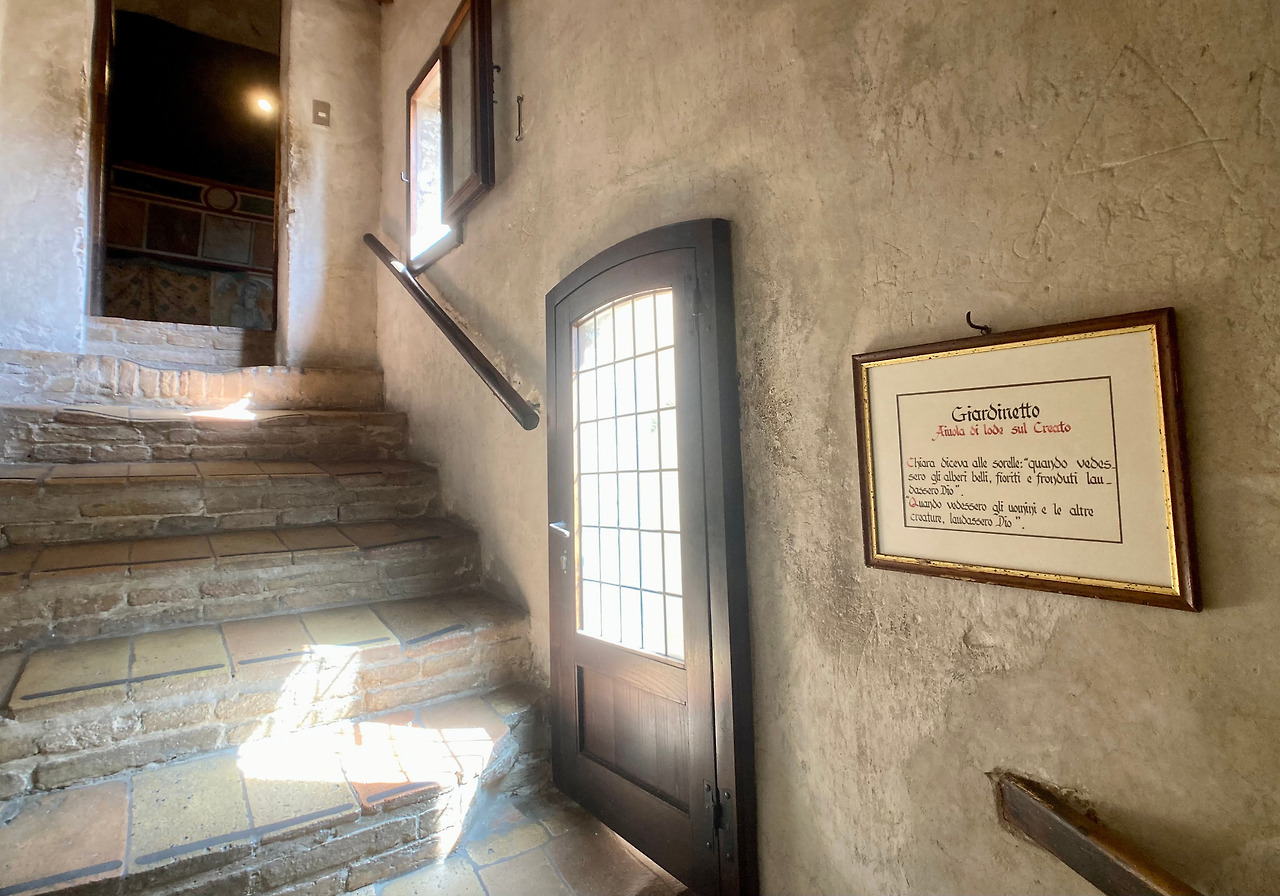 이층과 연결된 계단을 통해 오르다 보면 성녀 글라라의 작은 정원과 통하는 조그만 문이 나옵니다. 수도원 밖으로 나갈 수 없었던 성녀와 자매들은 움브리아 지방의 평야와 계곡이 보이는 이곳의 자연과 하늘을 보며 기도할 수 있었던 유일한 장소였습니다. 전승에 의하면 이곳 아래에서 라베르나 산에서 오상을 받은 성 프란치스코가 말년에 그 유명한 태양의 찬가를 쓰셨다고 합니다. 선종하시기 1년 전에 작성하셨으니 사실 눈이 안 보이던 상태였었고 그럼에도 이런 아름다운 찬미가를 불렀다는 것은 육안으로 보이는 세상이 아니라 혜안으로 보이는 하느님과 함께하는 조화로운 진짜 세상을 찬미한 것입니다.