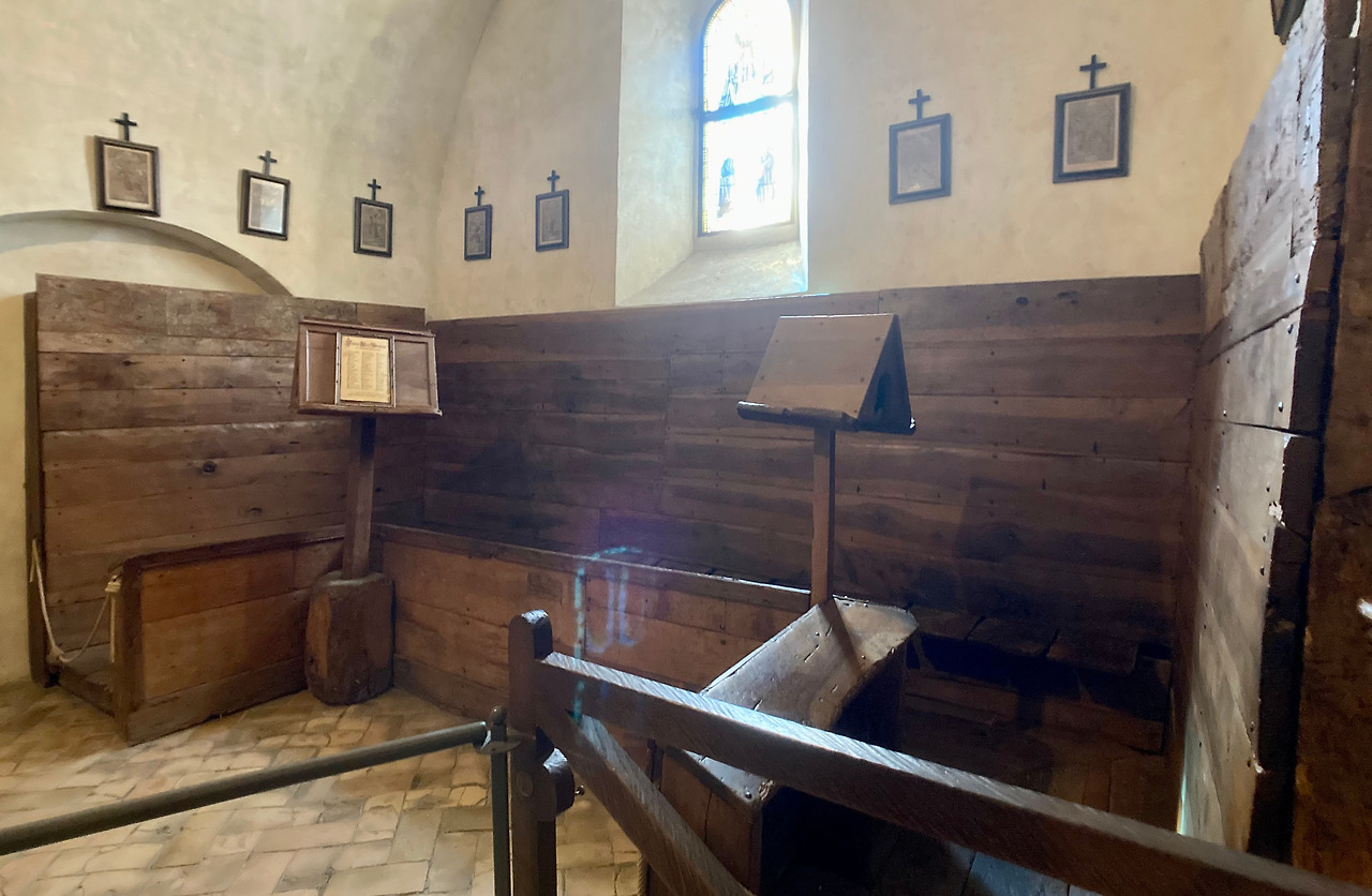 계속해서 이곳에서 볼 수 있는 글라라 성녀와 수녀들이 기도했던 나무로 만들어진 가대가 있는 작은 기도소가 있습니다. 다듬어지지 않은 투박한 나무로 만든 독서대와 기도석은 성녀가 살아계셨을 당시의 시절로 우리를 안내하는 듯합니다. 수녀원의 심장인 이 장소는 우리에게 기도란 하느님을 향한 찬미와 귀 기울임 그리고 신랑이신 예수님을 기다리기 위한 애독과 묵상이라고 이야기합니다. 하루가 시작되는 자정에 성녀는 이곳에서 촛불을 밝히며 자매들을 초대하였듯이 우리를 스승이신 예수님에게로 안내하는 기도의 시간으로 초대하고 있습니다.