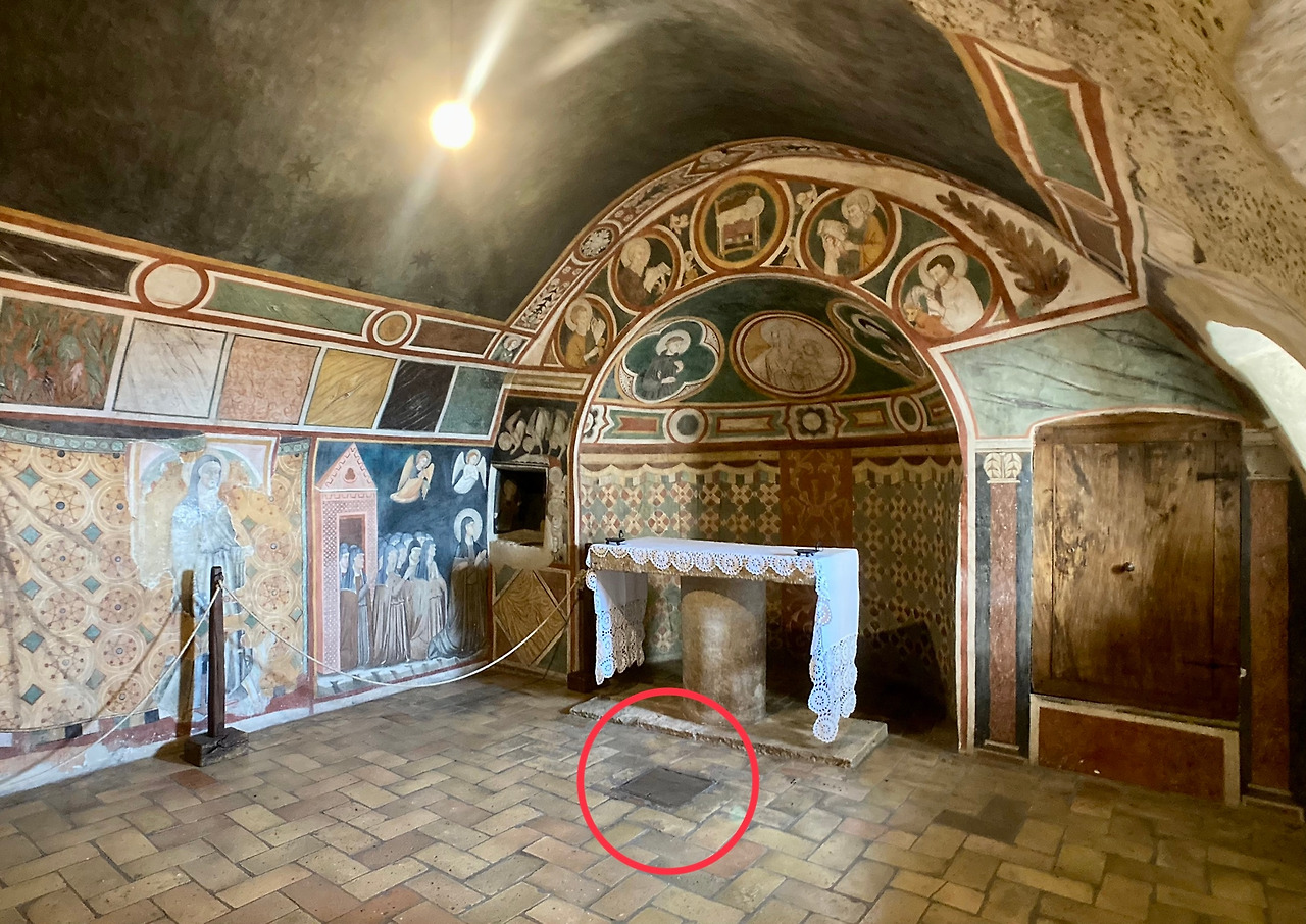 계단을 끝까지 오르면 다미아노 성당 제대 위쪽으로 만들어진 성녀 글라라의 경당에 들어가게 됩니다. 성녀는 1224년부터 선종하실 때까지 29년간 긴 병상 속에서 수도 생활을 하였습니다. 그래서 성당이나 기도 속에 내려가기 어려울 때 성녀가 기도하고 미사를 드릴 수 있도록 잠자는 곳과 가까운 장소에 경당이 필요했을 것입니다. 왜냐하면 성녀에게 가장 중요한 시간은 성체성사가 이루어지는 미사였기 때문입니다. 제대 앞바닥에는 다미아노 성당 가대가 보이는 사각 나무로 된 덮개가 있습니다. 이 구멍의 용도는 등을 내려보내기 위한 것이라고도 하지만 아마도 성당까지 내려갈 수 없었던 성녀가 미사 소리를 들으면서 이 구멍을 통해 사제가 올려주는 성체를 영하였을 것입니다.