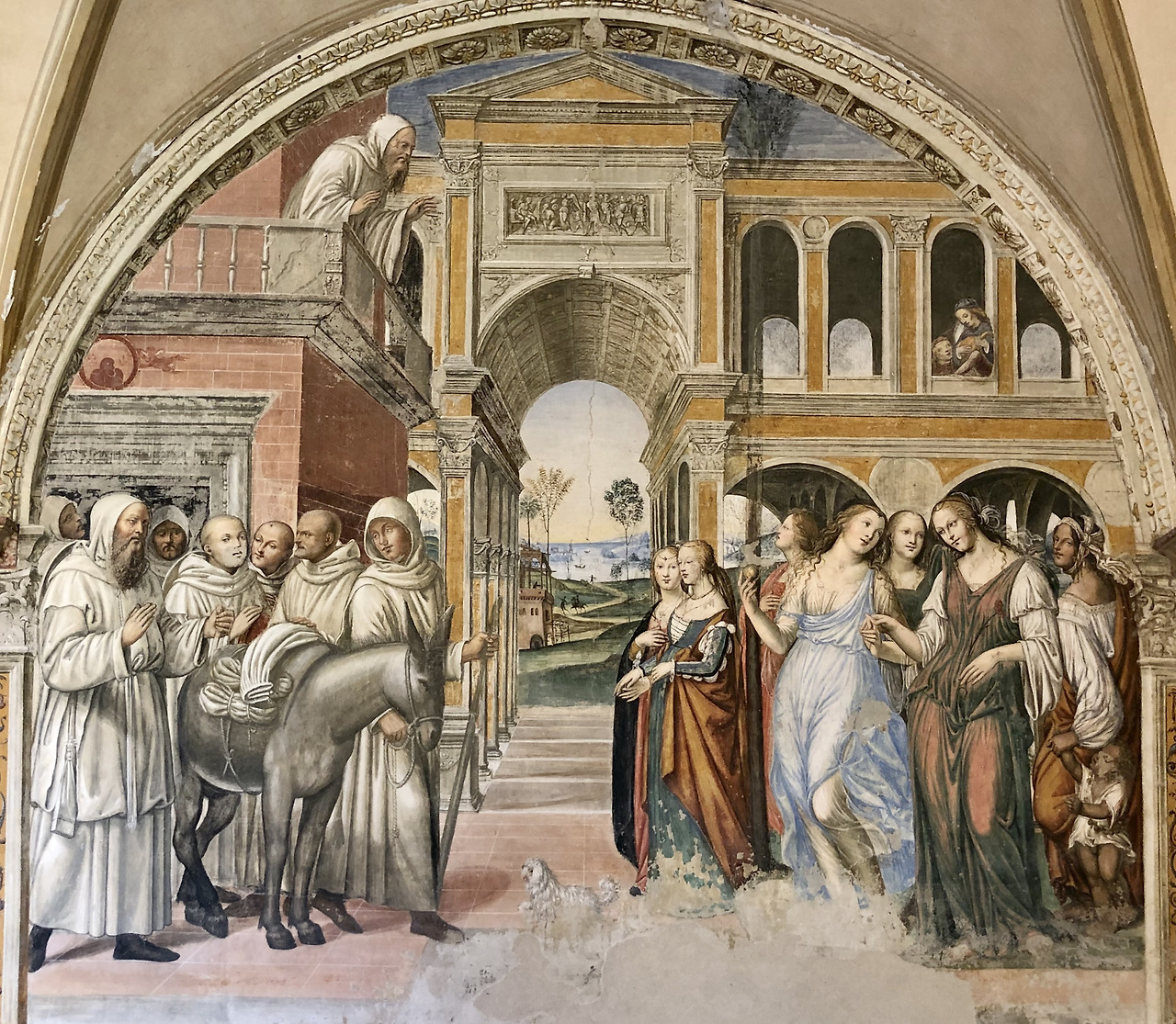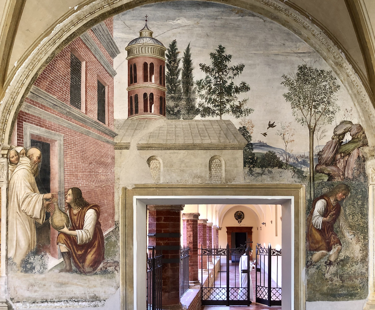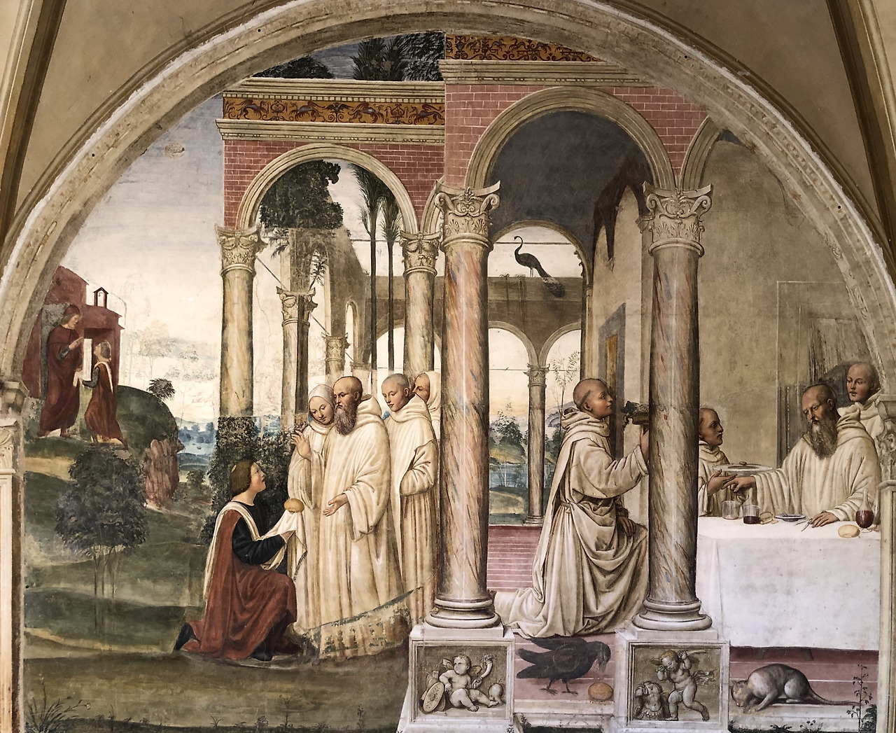 이 그림은 성인께서 선교를 위하여 플라치도는 시칠리아로 마우로는 프랑스로 파견하는 장면입니다. 하지만 시간순으로 볼 때 이 그림의 전후 내용의 그림과 아무 상관이 없는 장면입니다. 왜냐하면 플라치도를 파견한 것은 약 537년이고 마우로를 파견한 것은 약 546년이기 때문입니다. 547년 경에 성인께서 몬테카시노에서 선종하시기 때문에 사실 이 장면은 성인께서 선종하시기 전인 마지막 부분에 등장할 내용이라고 할 수 있습니다. 이 그림은 소도마의 공방에서 그림을 배우고 또 그의 사위가 된 일명 리쵸 (Riccio)라고 불리던 바르톨로메오 네로니 (Bartolomeo Neroni, 1505-1571)가 그렸습니다. 우리가 보기에 성인 왼편에 있는 사람은 프랑스 왕 샤를 5세이지만, 리쵸는 왕의 얼굴에 자신의 얼굴을 자화상처럼 그렸습니다. 이 그림은 1536년 이 수도원을 방문한 샤를 5세를 기념하여 그려졌습니다.